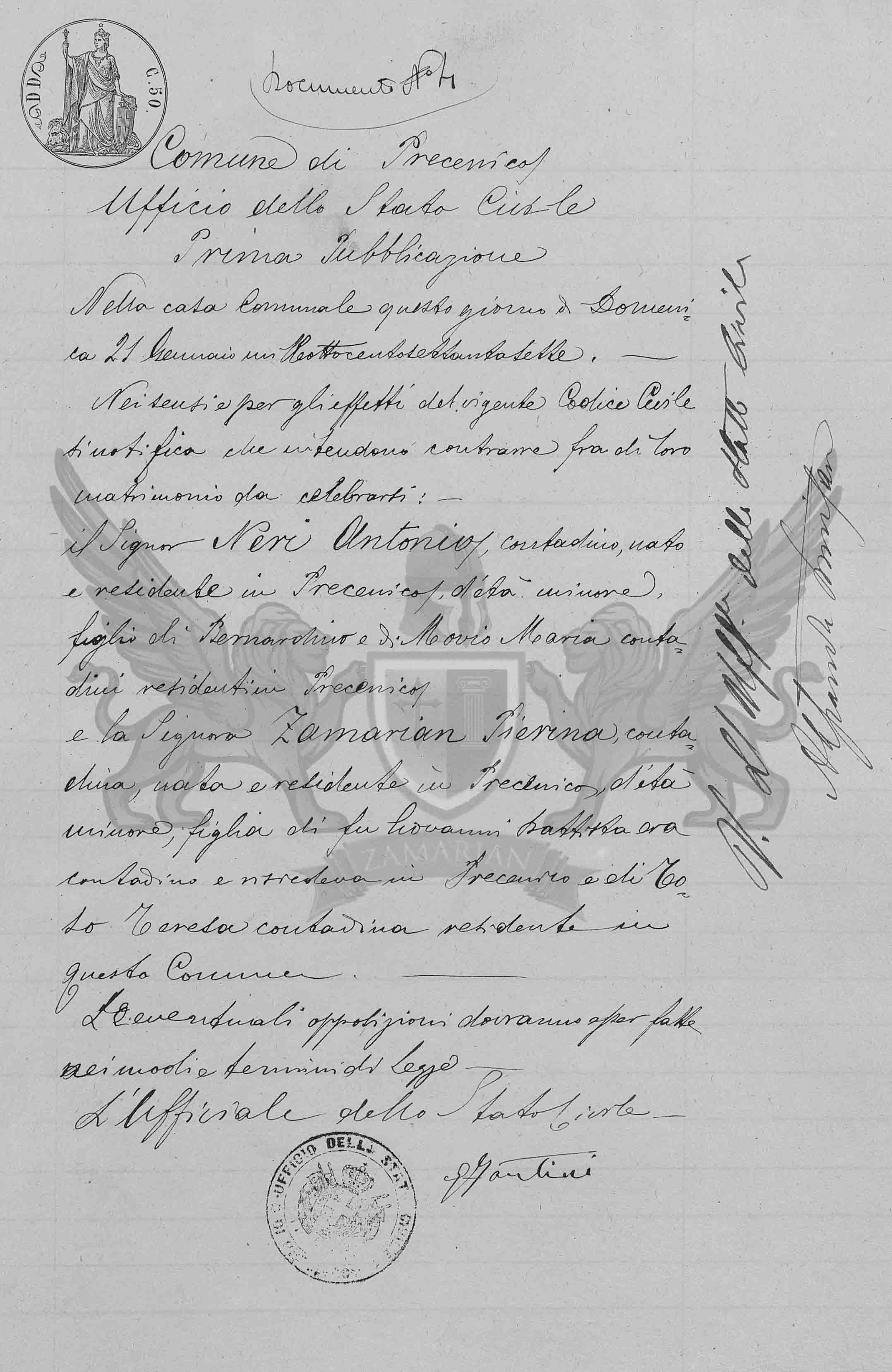 O Senhor Neri Antonio, camponês, nascido e residente em Precenicco, de idade menor, filho de Bernardino e de Movio Maria camponeses residentes em Precenicco e a Senhora Zamarian Pierina, camponesa, nascida e residente em Precenicco, de idade menor, filha do falecido Giovanni Battista era camponês e residia em Precenicco e de Toso Teresa camponesa residente neste Município.
