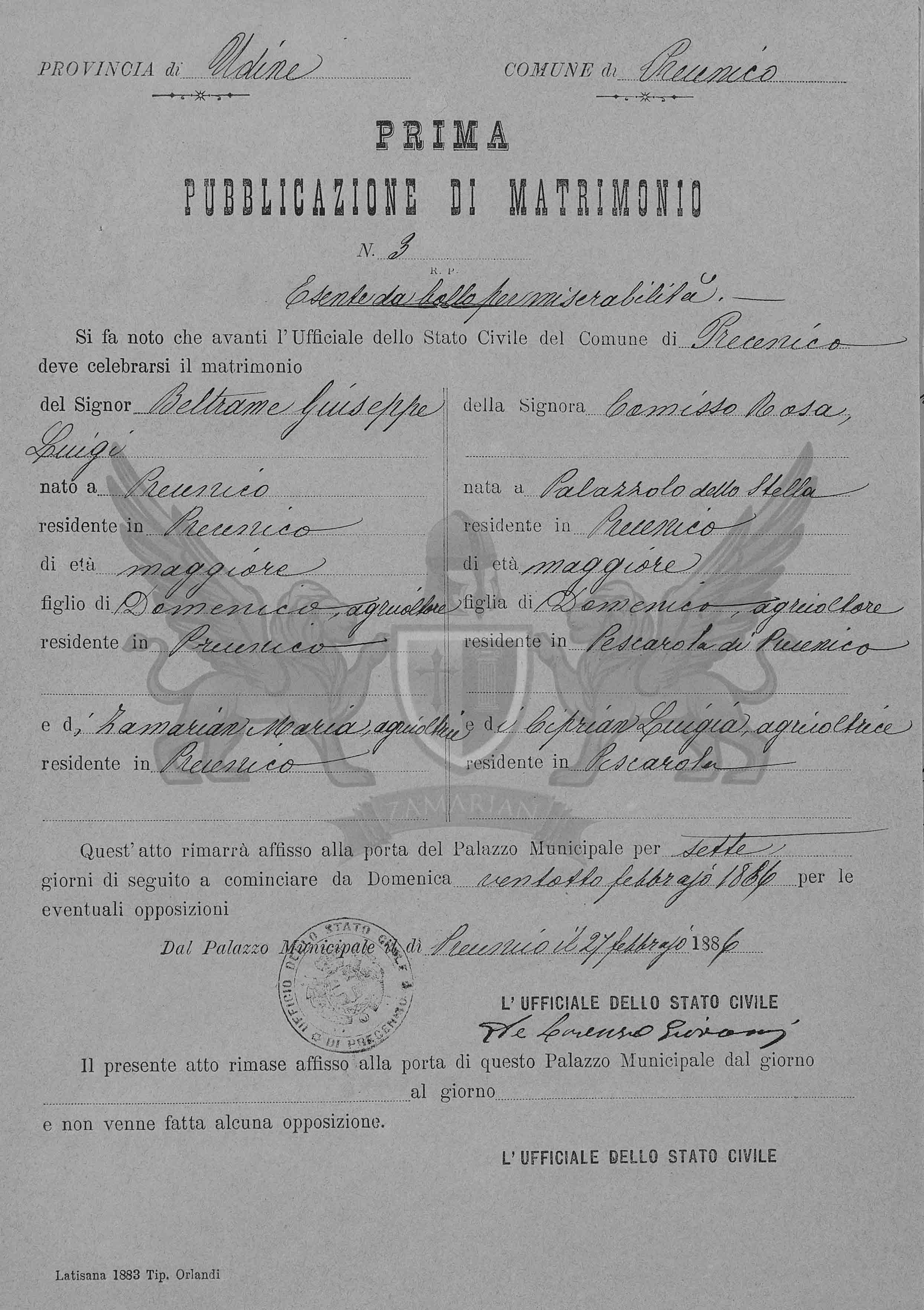 Se faz notório que diante do Oficial do Estado Civil do Município de Precenicco deve celebrar-se o matrimônio do Senhor Beltrame Giuseppe Luigi nascido em Precenicco, residente em Precenicco, de idade maior, filho de Domenico, agricultor, residente em Precenicco e de Zamarian Maria, agricultora, residente em Precenicco e da Senhora Comisso Rosa, nascida em Palazzolo dello Stella, residente em Precenicco, de idade maior, filha de Domenico, agricultor e de Ciprian Luigia, agricultora, residente em Lestizza.