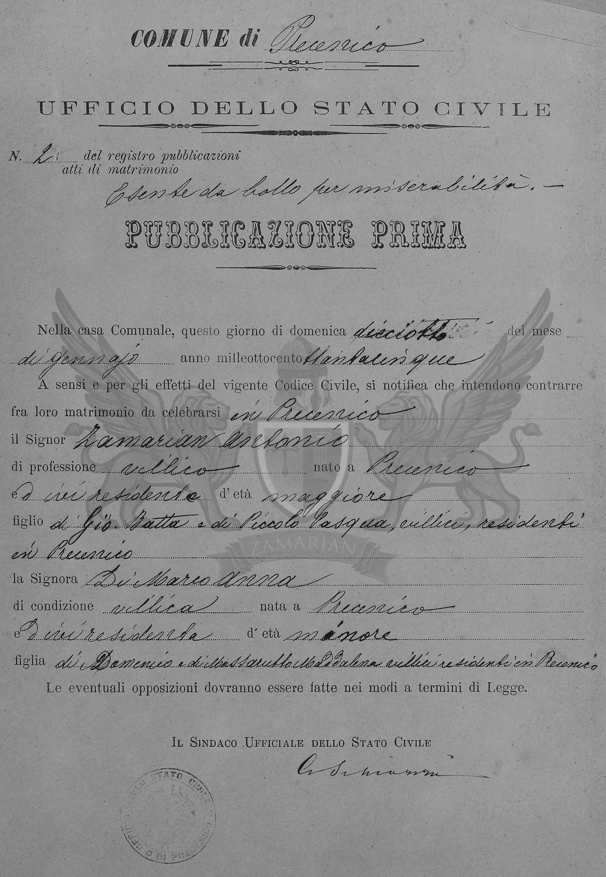 A sensos e pelos efeitos do vigente Código Civil, notifica-se que intentem contrair entre eles matrimônio a celebrar-se em Precenicco o Senhor Zamarian Antonio de profissão camponês, nascido em Precenicco e onde é residente de idade maior, filho de Giovanni Battista e de Piccolo Pasqua, camponeses, residentes em Precenicco e a senhora Di Marco Anna de condição camponesa, nascida em Precenicco e onde é residente, de idade menor, filha de Domenico e de Massarutto Maddalena, camponeses, residentes em Precenicco.
