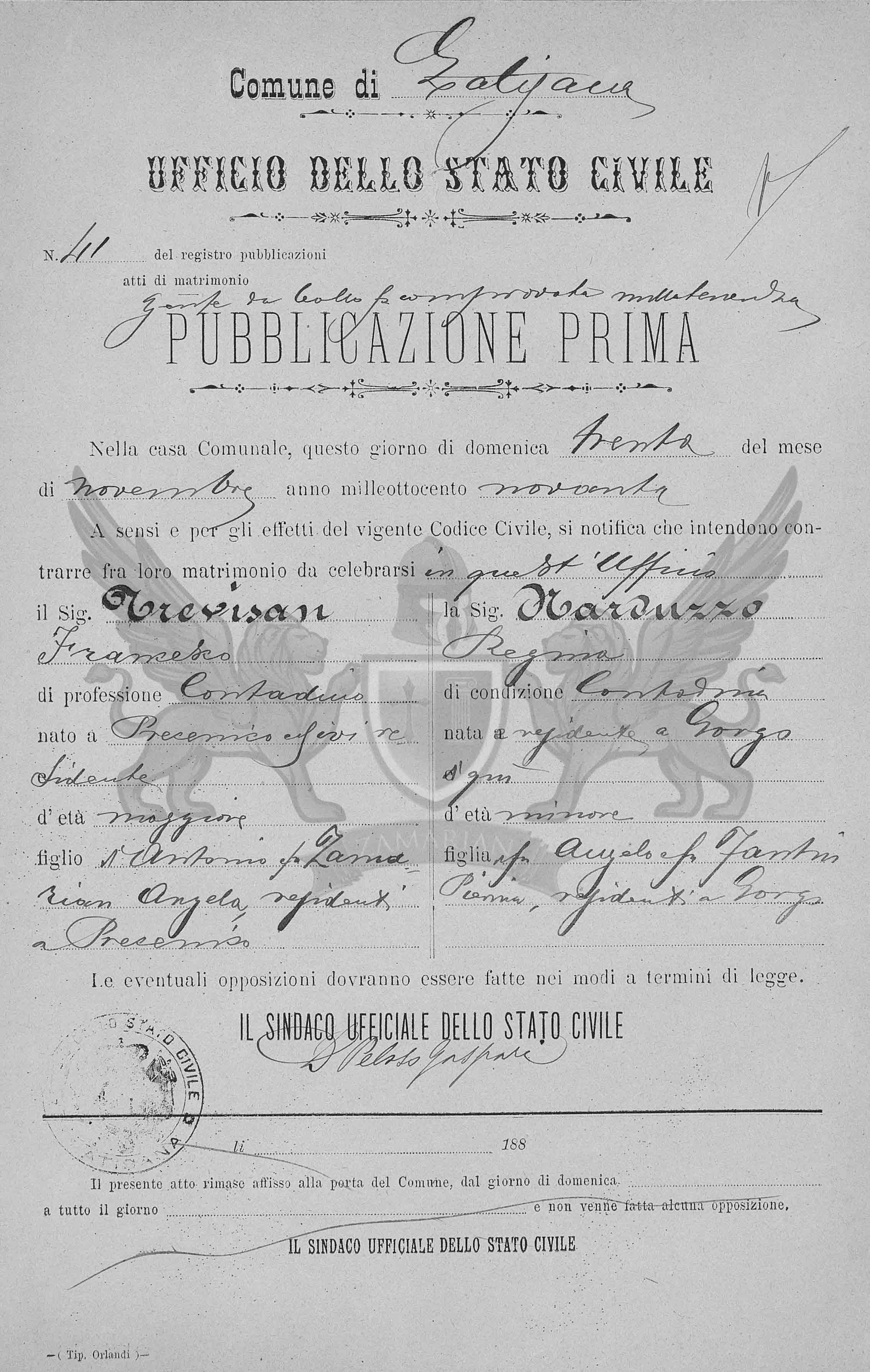 A sensos e pelos efeitos do vigente Código Civil, se notifica que ontem contrair matrimônio entre eles a celebrar neste Ofício o Senhor Trevisan Francesco de profissão camponês nascido em Precenicco,e onde é residente, de idade maior, filho de Antonio e da falecida Zamarian Angela, residentes em Precenicco e a Senhora Narduzzo Regina de condição camponesa, nascida e residente em Gorgo daqui, de idade menor, filha do falecido Angelo e falecida Fantin Pierina, residentes em Gorgo.