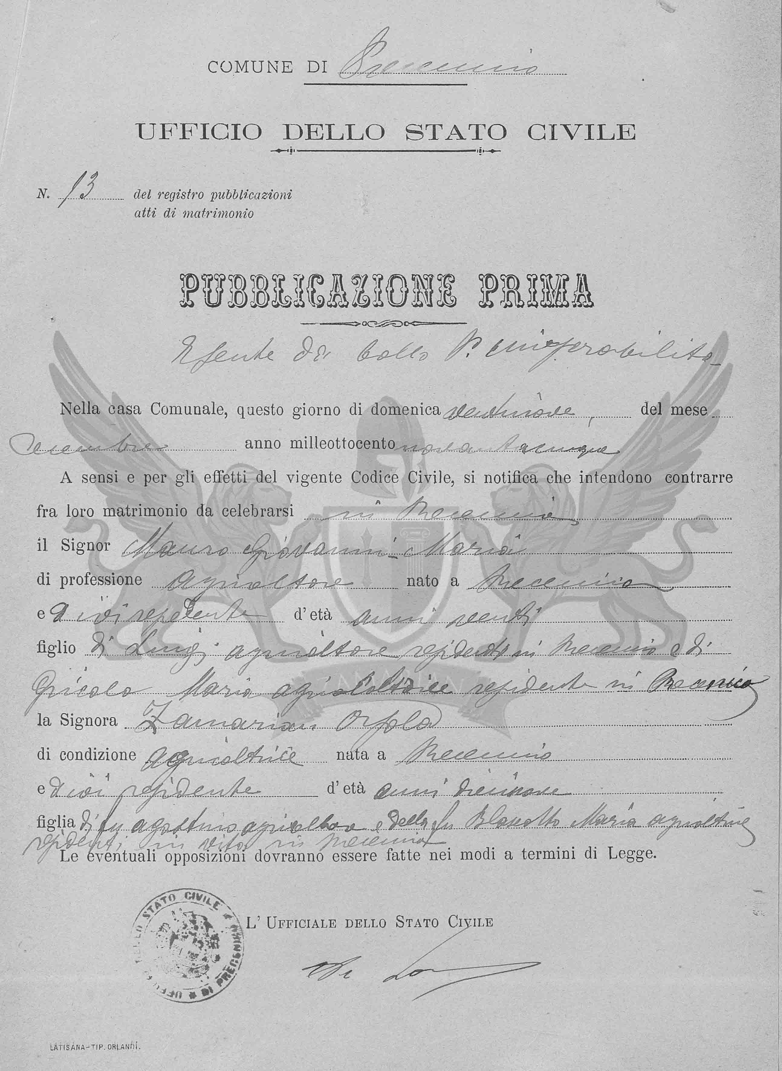 A sensos e para os efeitos do vigente Código Civil, se notifica que intendem contrair entre eles matrimônio a celebrar-se em Precenicco, o Senhor Mauro Giovanni Maria, de profissão agricultor, nascido em Precenicco, onde é residente, de idade vinte anos, filho de Luigi, agricultor residente em Precenicco e de Gricolo Maria, agricultora, residente em Precenicco, e a Senhora Zamarian Orsola, de condição agricultora, nascida em Precenicco e onde é residente, de idade dezenove anos, filha do falecido Agostino, agricultor e da falecida Blaseotto Maria, agricultora, residentes em vida em Precenicco.