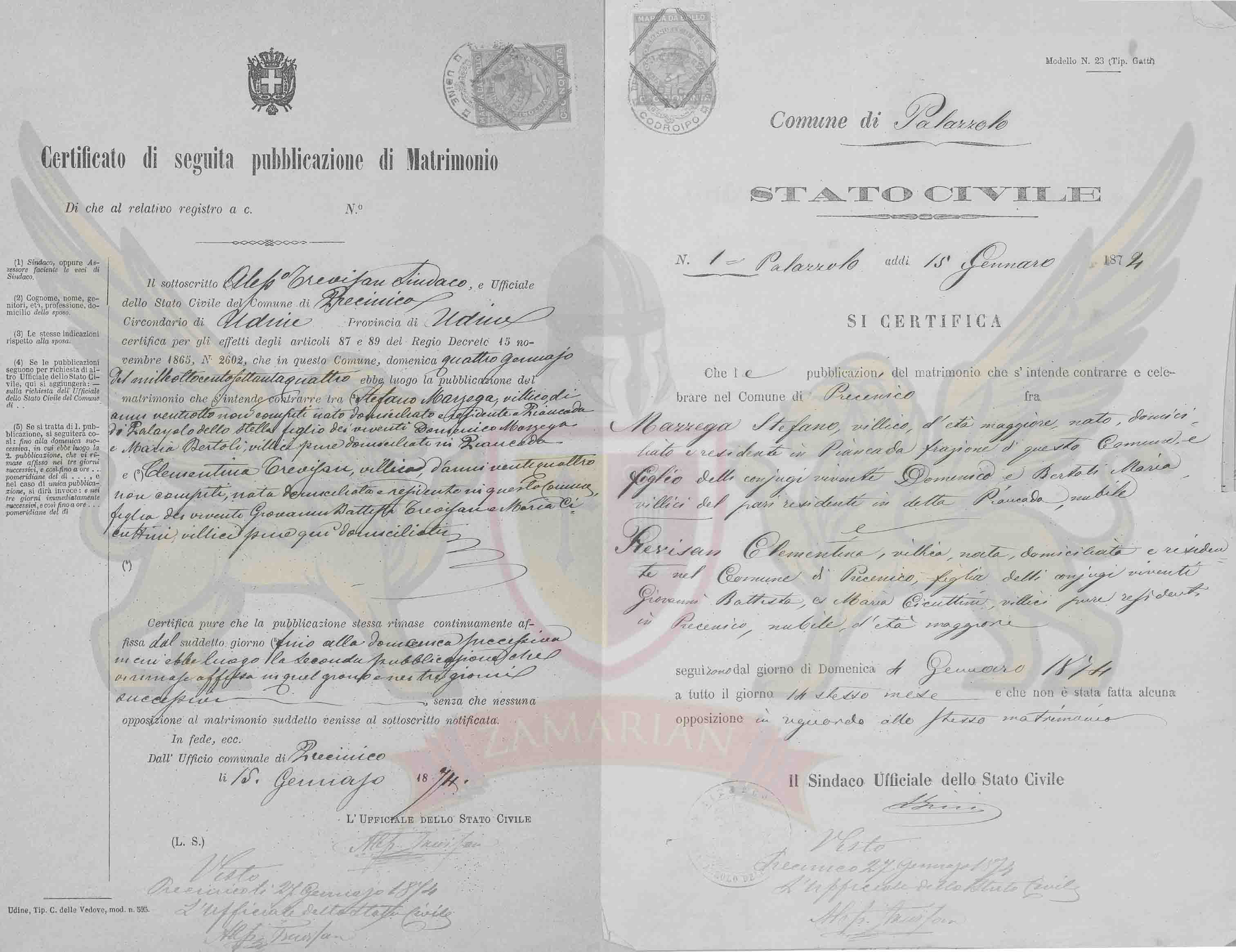 Que as publicações de matrimônio que se entende contrair no Município de Precenicco entre Mazzega Stefano, camponês, de idade maior, nascido, domiciliado e residente em Piancada fração deste Município, e filho dos cônjuges viventes Domenico e Bertoli Maria camponeses, residentes na dita Piancada, solteiro e Trevisan Clementina, camponesa, nascida, domiciliada e residente no Município de Precenicco, filha dos cônjuges viventes Gionanni Battista, e Maria Cicuttini, camponeses, também residentes em Precenicco solteira, de idade maior seguiram do dia de domingo 4 de janeiro de 1874 até o dia 14 do mesmo mês e que não fora feita alguma oposição em relação ao mesmo matrimônio.