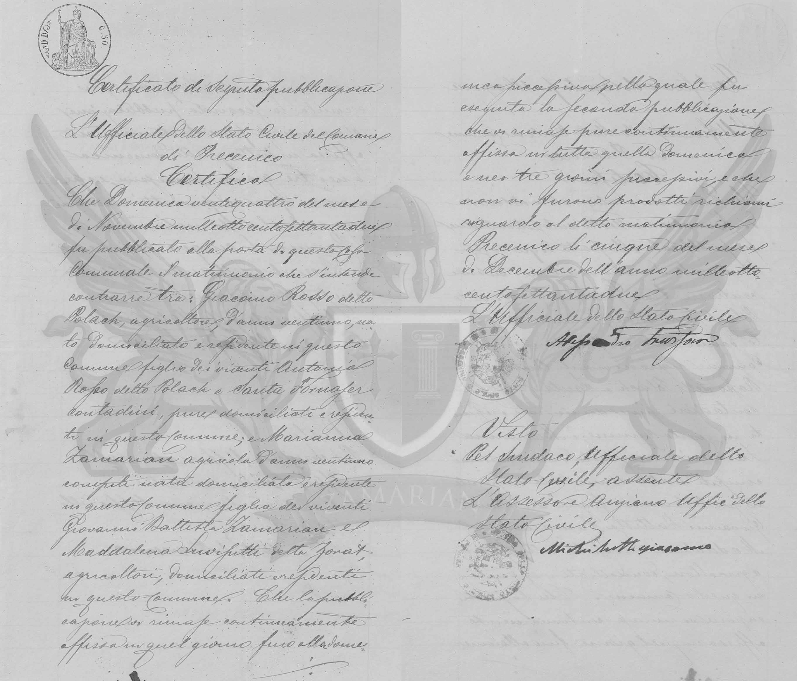 Que Domingo vinte e quatro do mês de Novembro do ano de Mil oitocentos e setenta e dois foi publicado à porta desta Casa Municipal o matrimônio que se entende contrair entre: Giacomo Rosso conhecido Polach, agricultor, de vinte e um anos, domiciliado e residente neste Município filho dos viventes Antonio Rosso conhecido Polach e Santa Fornasier camponeses também domiciliados e residentes neste Município; e Marianna Zamarian, agricultora, de vinte e um anos completos, nascida, domiciliada e residente neste Município filha dos viventes Giovanni Battista Zamarian e Maddalena Luvizutti conhecida Zorat, agricultores, domiciliados e residentes neste Município. Que a publicação permaneceu continuamente afixada daquele dia até o domingo recessivo, na qual foi exibida a segunda publicação que da mesma forma permaneceu continuamente fixada em todo aquele Domingo e nos três dias sucessivos, e que não foram produzidos reclames em relação ao matrimônio.