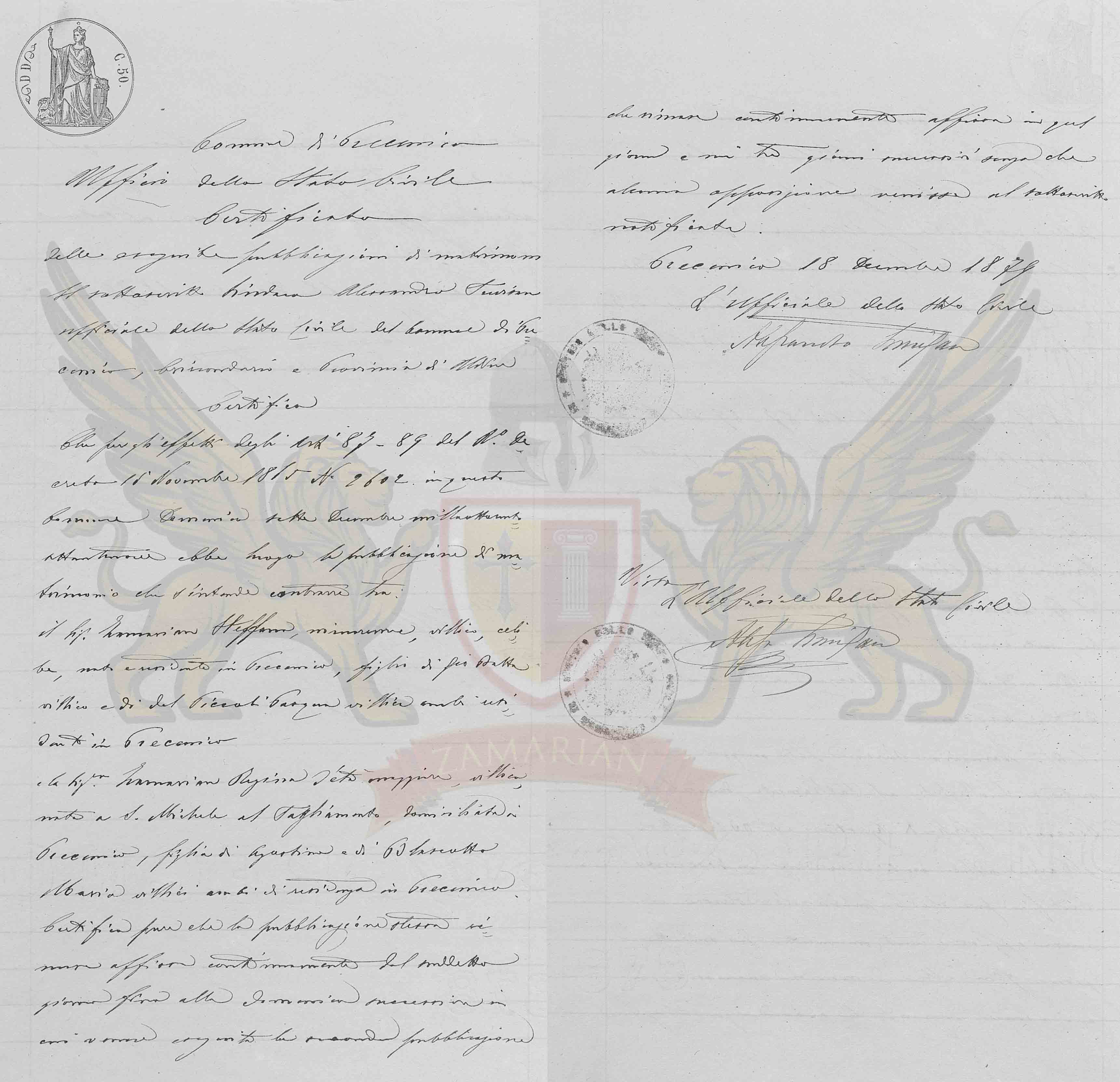 O subscrito Alessandro Trevisan Síndico Oficial do Estado Civile do Municipio de Precenicco, Circundário e Província de Udine