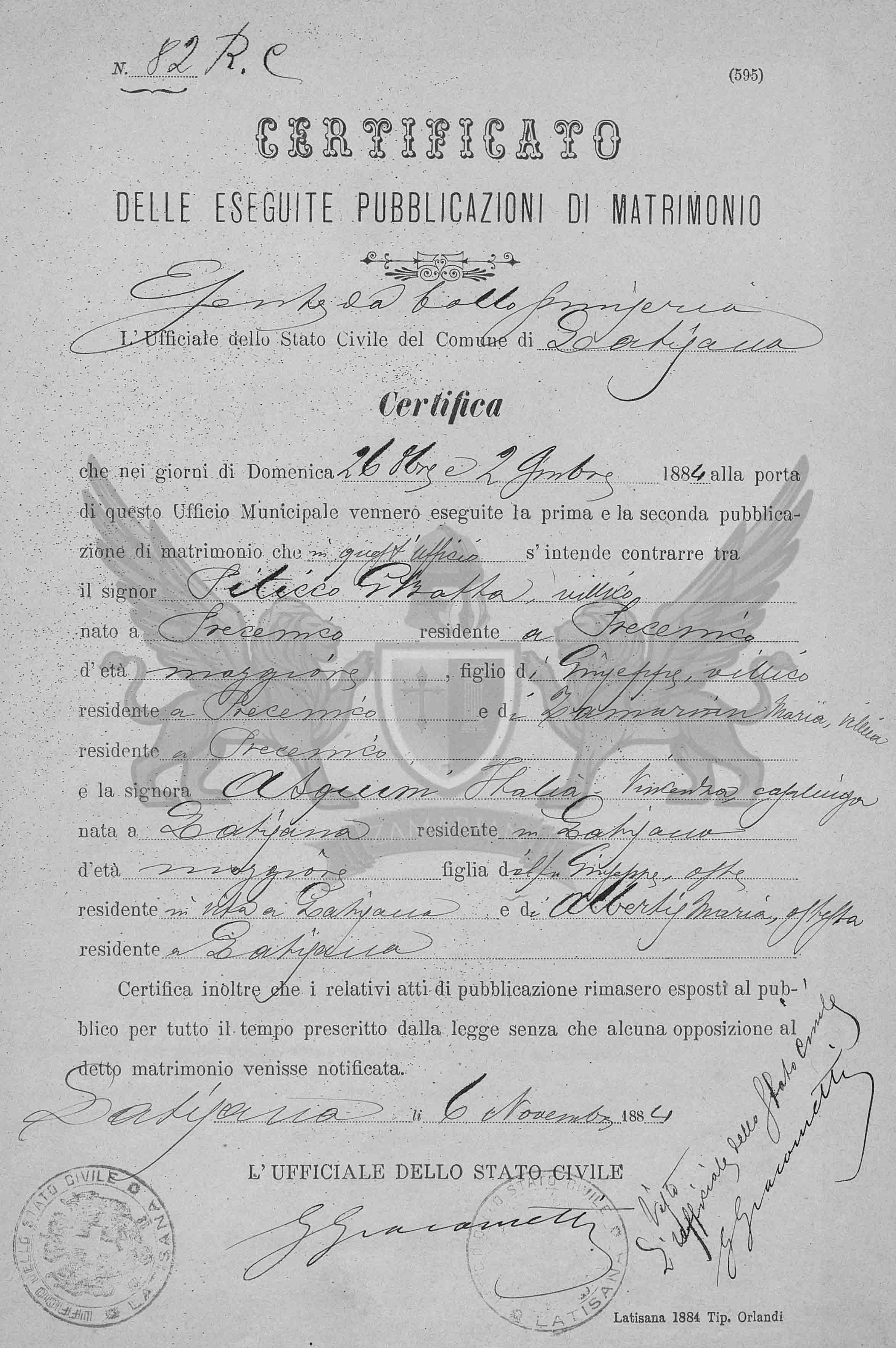 Que nos dias de Domingo 26 de outubro e 2 de novembro de 1884 à porta deste Ofício Municipal vieram exibidas a primeira e segunda publicação de matrimônio que neste ofício se intende contrair entre o senhor Piticco Giovanni Battista, camponês, nascido em Precenicco residente em Precenicco de idade maior, filho de Giuseppe, camponês, residente em Precenicco e de Zamarian Maria, camponesa, residente em Precenicco e a senhora Asquini Italia Vincenza, dona de casa, nascida em Latisana, de idade maior, filha do falecido Giuseppe, garçom, residente em vida em Latisana e de Albertis Maria, garçonete, residente em Latisana.