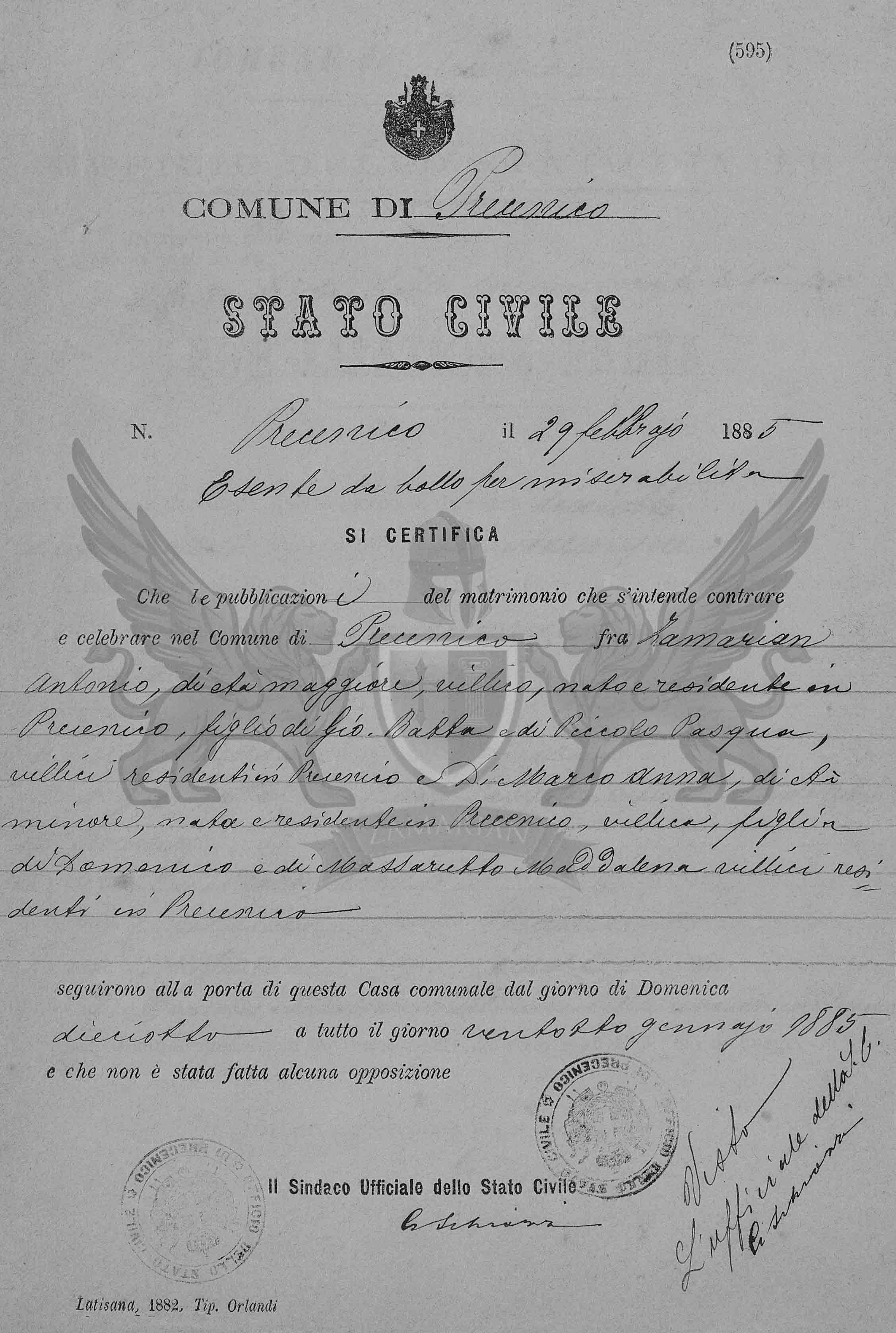 Que as publicações de matrimônio que se intende contrair e celebrar no Município de Precenicco entre Zamarian Antonio, de idade maior, camponês, nascido em Precenicco, e residente em Precenicco, filho de Giovanni Battista e de Piccolo Pasqua, camponeses, residentes em Precenicco, e Di Marco Anna, de idade menor, nascida e residente em Precenicco, camponesa, filha de Domenico e de Massarutto Maddalena, camponeses, residentes em Precenicco, seguiram à porta desta Casa Municipal do dia de Domingo dezoito a todo o dia vinte e oito de janeiro de 1885 e que não fora feita alguma oposição