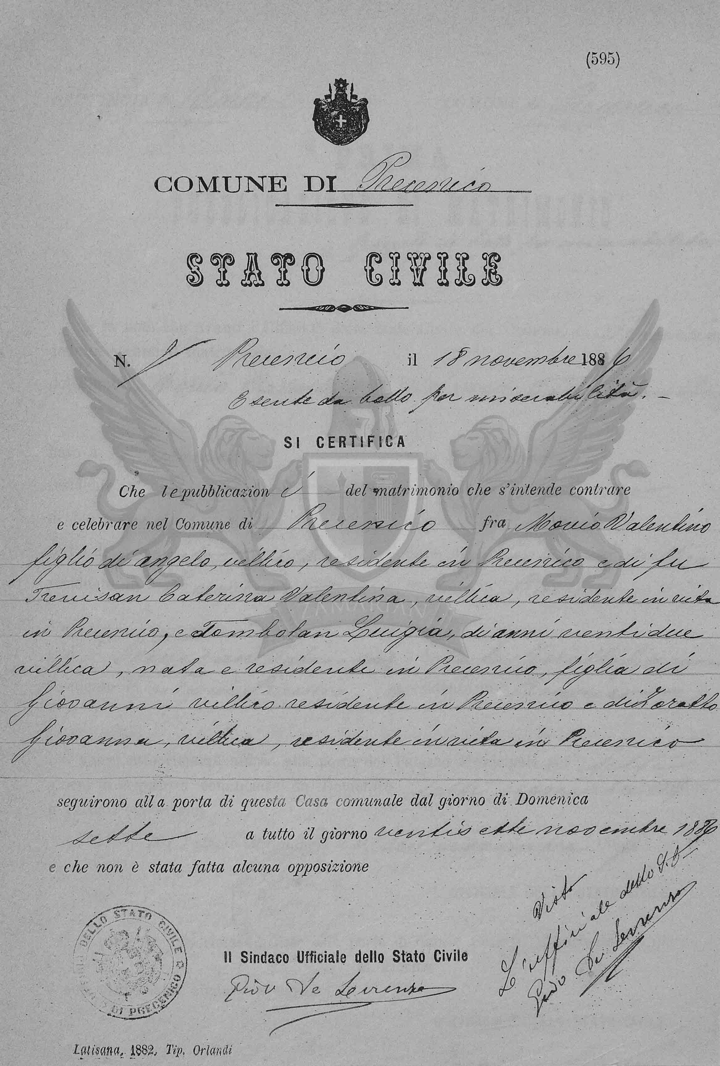 Que as publicações do matrimônio che se intende contrair e celebrar no Município de Precenicco entre Movio Valentino filho de Angelo, camponês, residente em Precenicco e da falecida Trevisan Caterina Valentina, camponesa, residente em vida em Precenicco, e Tombolan Luigia, de vinte e dois anos, camponesa, nascida e residente em Precenicco, filha de Giovanni camponês residente em Precenicco e de Zoratto Giovanna, camponesa, residente em vida em Precenicco, seguiram à porta desta Casa municipal do dia de Domingo sete a todo o dia vinte de novembro de 1886 e que não fôra feita alguma oposição.