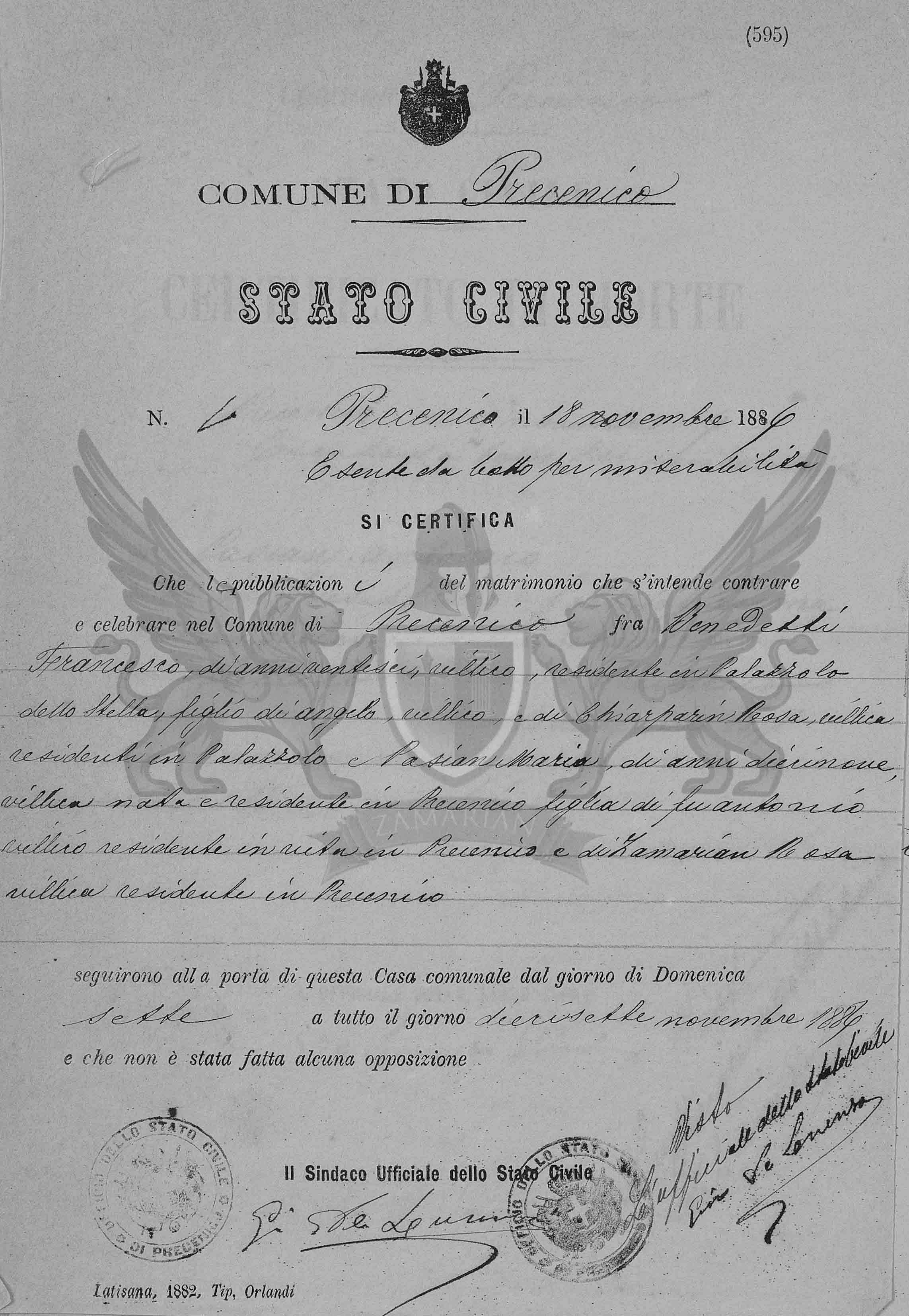 Que as publicações de matrimônio que se intende contrair e celebrar no Município de Precenicco entre Benedetti Francesco, de vinte e seis anos, camponês, residente em Palazzolo dello Stella, filho de Angelo, camponês e de Chiarparin Rosa, camponesa, residente em Palazzolo e Pasian Maria, de dezenove anos, camponesa, nascida e residente em Precenicco, filha do falecido Antonio, camponês, residente em vida em Precenicco, e de Zamarian Rosa, camponesa, residente em Precenicco, seguiram à porta desta Casa Municipal do dia de Domingo sete a todo o dezessete de novembro de 1886 e que não fora feita alguma oposição