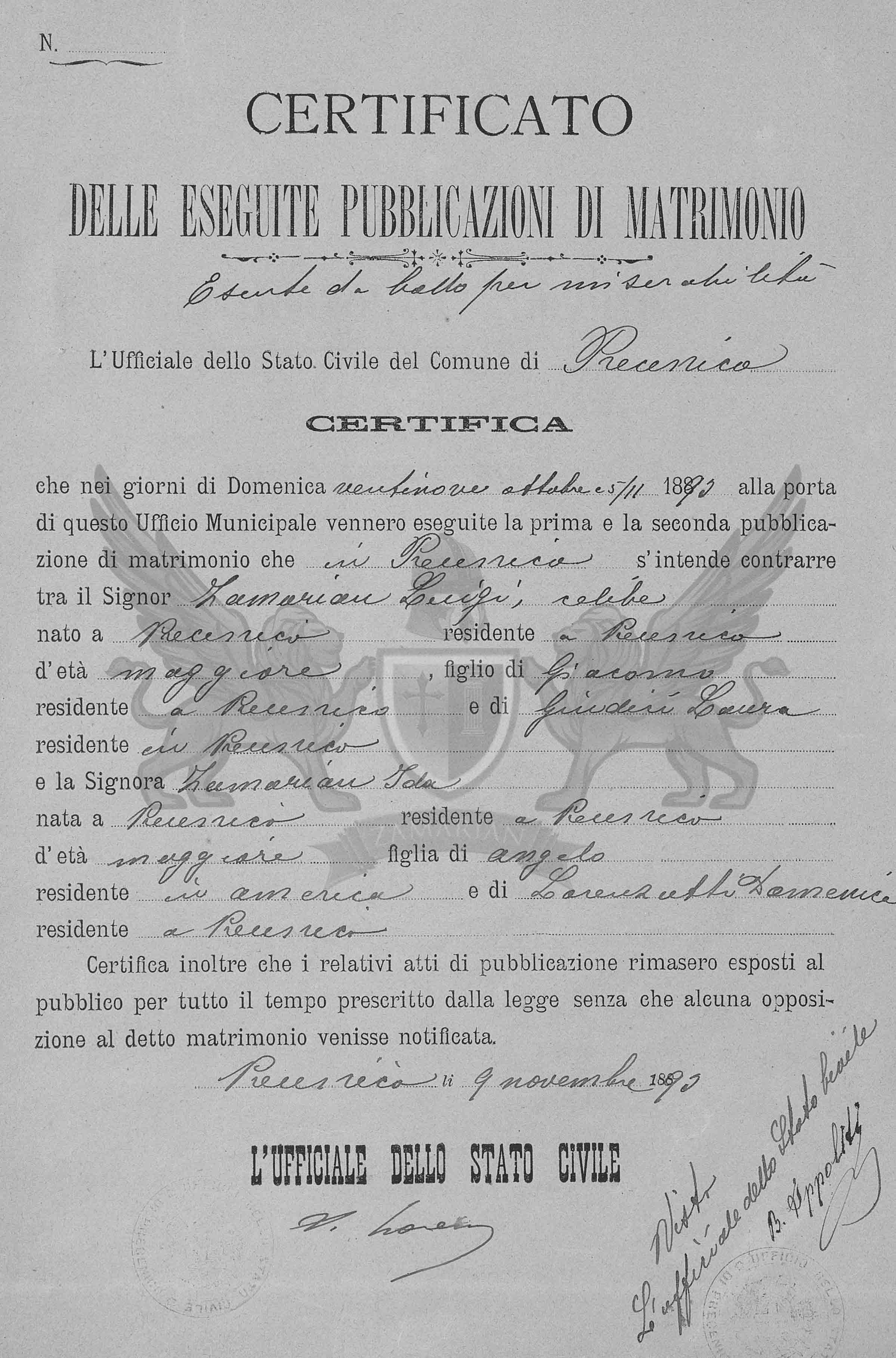 Que nos dias de Domingo vinte e vinte nove de outubro e cinco de novembro de 1893 à porta deste Ofício Municipal foram exibidos a primeira e segunda publicações de matrimônio que neste Ofício se intende contrair entre o Senhor Senhor Zamarian Luigi, solteiro, nascido em Precenicco, residente em Precenicco, de idade maior, filho de Giacomo, residente em Precenicco e de Giudici Laura, residente em Precenicco, e a Senhora Zamarian Ida, nascida em Precenicco, residente em Precenicco, de idade maior, filha de Angelo, residente na America e de Lorenzutti Domenica, residente em Precenicco.