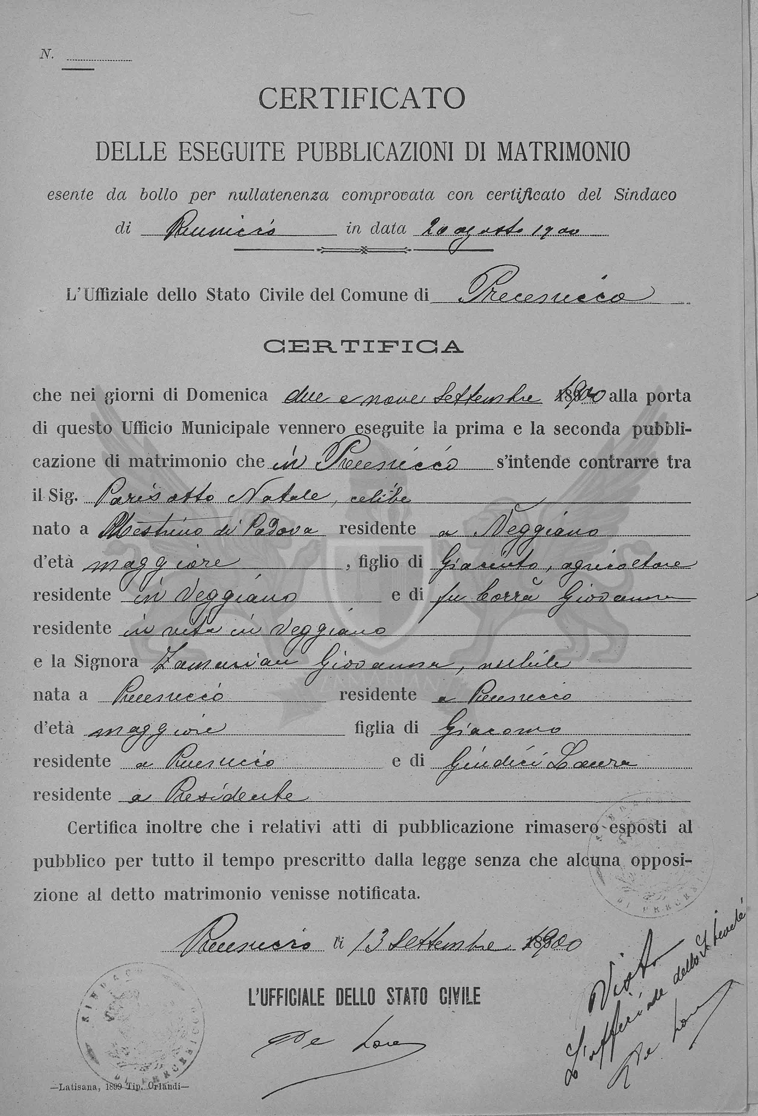 Que nos dias de Domingo dois e nove de setembro de 1900 à porta deste Ofício Municipal foram exibidos a primeira e segunda publicações de matrimônio que neste Ofício se intende contrair entre o Senhor Senhor Parisotto Natale, solteiro, nascido em Veggiano de Padova, residente em Veggiano, de idade maior, filho de Giacinto, agricultor, residente em Veggiano e da falecida Carrà Giovanna, residente em vida em Veggiano, e a Senhora Zamarian Giovanna, solteira, nascida em Precenicco, residente em Precenicco, de idade maior, filha de Giacomo, residente em Precenicco e de Giudici Laura, residente em Precenicco.