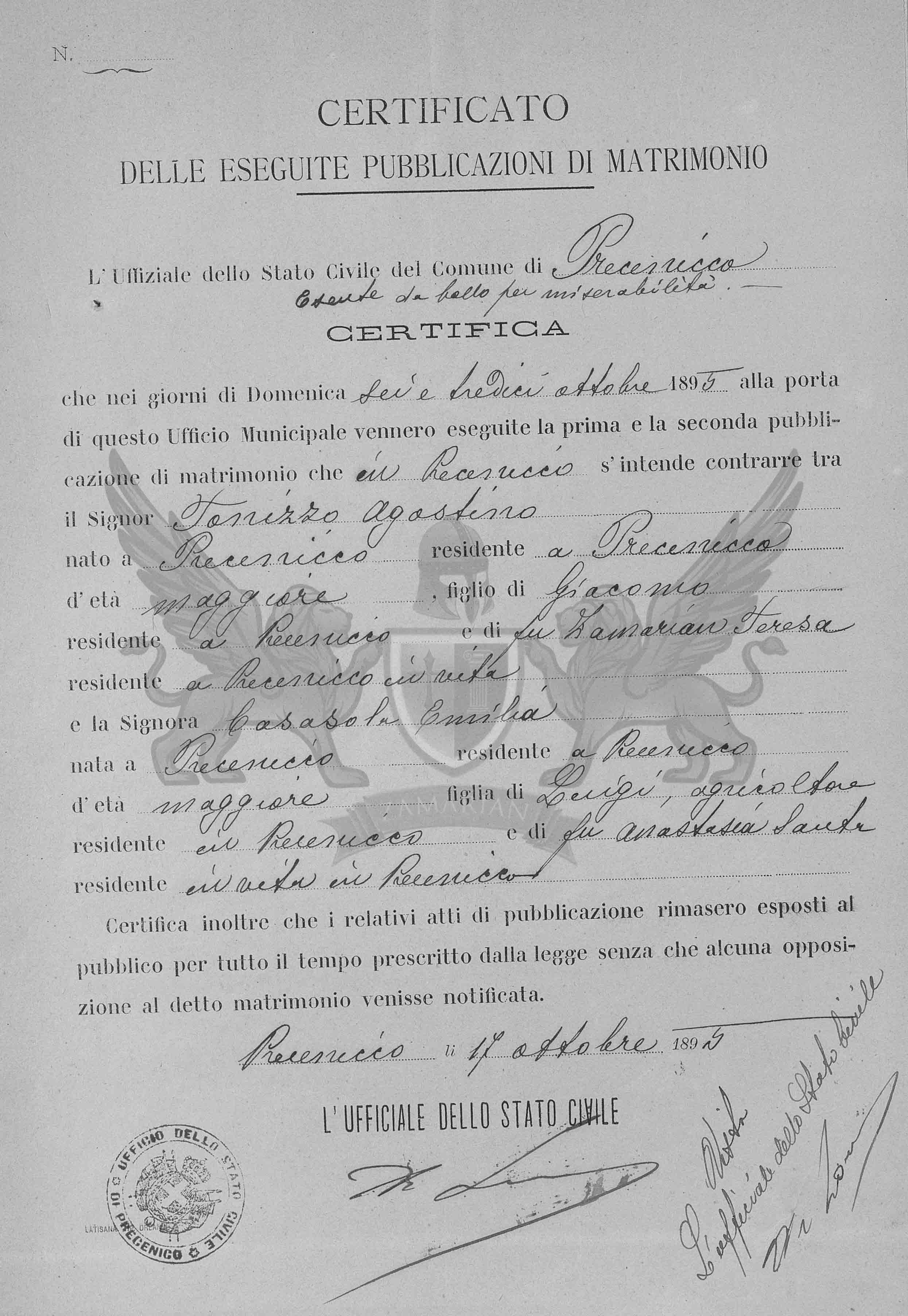 Que nos dias de Domingo seis e treze de outubro de 1895 à porta deste Ofício Municipal foram exibidos a primeira e segunda publicações de matrimônio que neste Ofício se intende contrair entre o Senhor Senhor Tonizzo Agostino, nascido em Precenicco, residente em Precenicco, de idade maior, filho de Giacomo, residente em Precenicco e da falecida Zamarian Teresa, residente em vida em Precenicco, e a Senhora Casasola Emilia, nascida em Precenicco, residente em Precenicco, de idade maior, filha de Luigi agricultor residente em Precenicco e da falecida Anastasia Santa, residente em vida em Precenicco.
