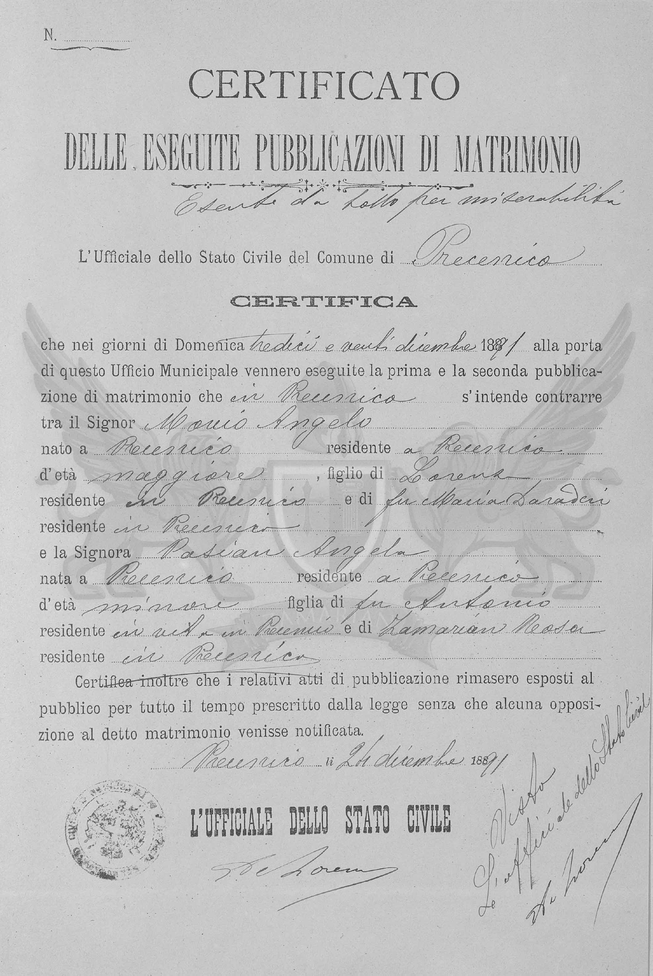 Que nos dias de Domingo treze e vinte de dezembro de 1891 à porta deste Ofício Municipal foram exibidos a primeira e segunda publicações de matrimônio que neste Ofício se intende contrair entre o Senhor Senhor Movio Angelo, nascido em Precenicco, residente em Precenicco de idade maior, filho de Lorenzo e da finada Maria Daradin, residentes em Precenicco e a Senhora Pasian Angela, Camponesa, nascida em Precenicco, residente em Precenicco, de idade menor, filha do finado Antonio e de Zamarian Rosa residente em Precenicco.