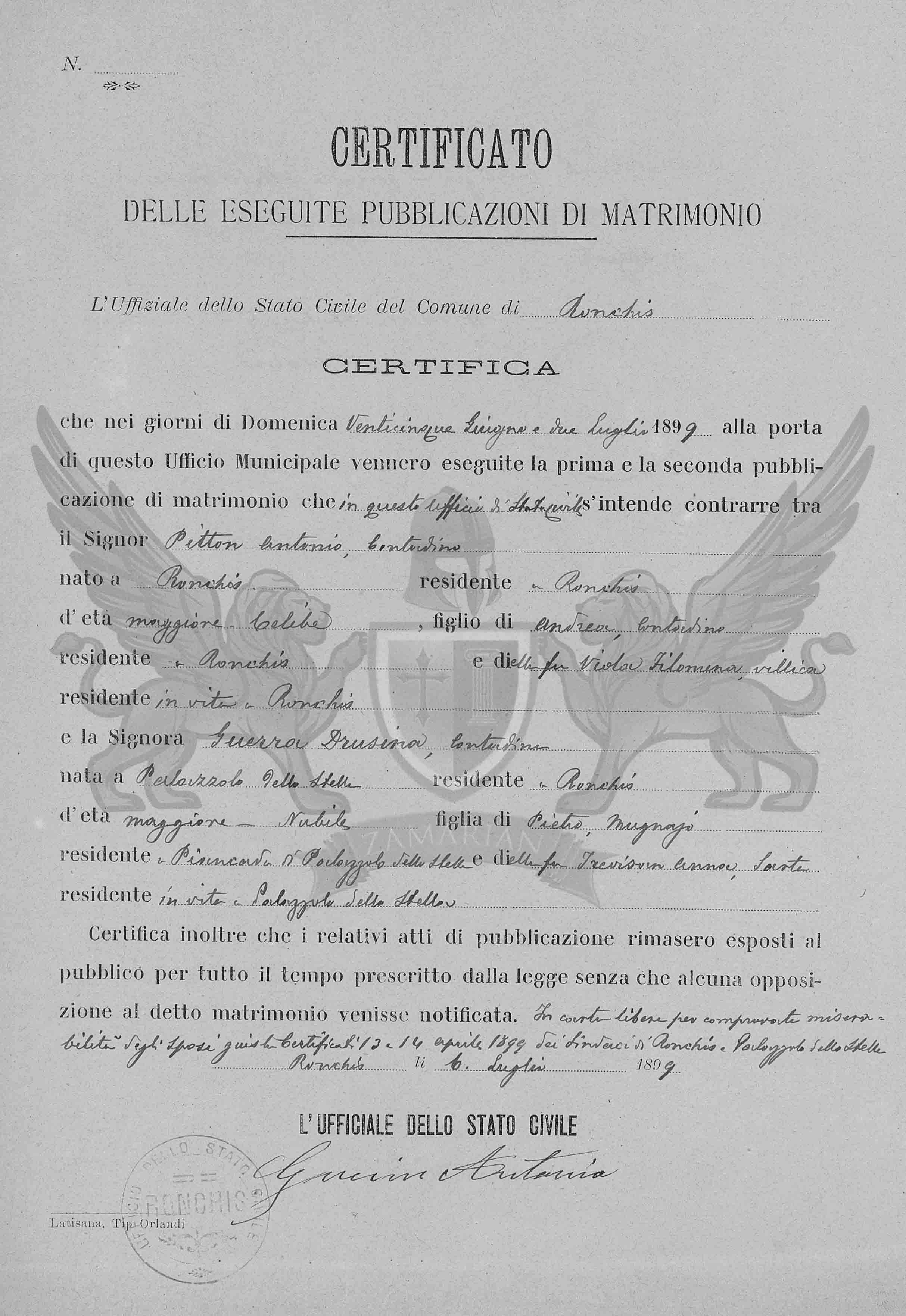Que nos dias de Domingo vinte e cinco de Junho e dois de Julho de 1899 à porta deste Ofício Municipal foram exibidos a primeira e segunda publicações de matrimônio se intende contrair neste ofício do Estado Civil entre o Senhor Senhor Pitton Antonio, camponês, nascido em Ronchis, residente em Ronchis, de idade maior, solteiro, filho de Andrea, camponês residente em Ronchis e de Viola Filomena, camponesa, residente em vida em Ronchis e a Senhora Guerra Drusina, camponesa, nascida em Palazzolo dello Stella, e residente em Ronchis, de idade menor, solteira, filha de Pietro, moedor, residente em Palazzolo e da falecida Trevisan Anna, residente em vida em Palazzolo dello Stella.