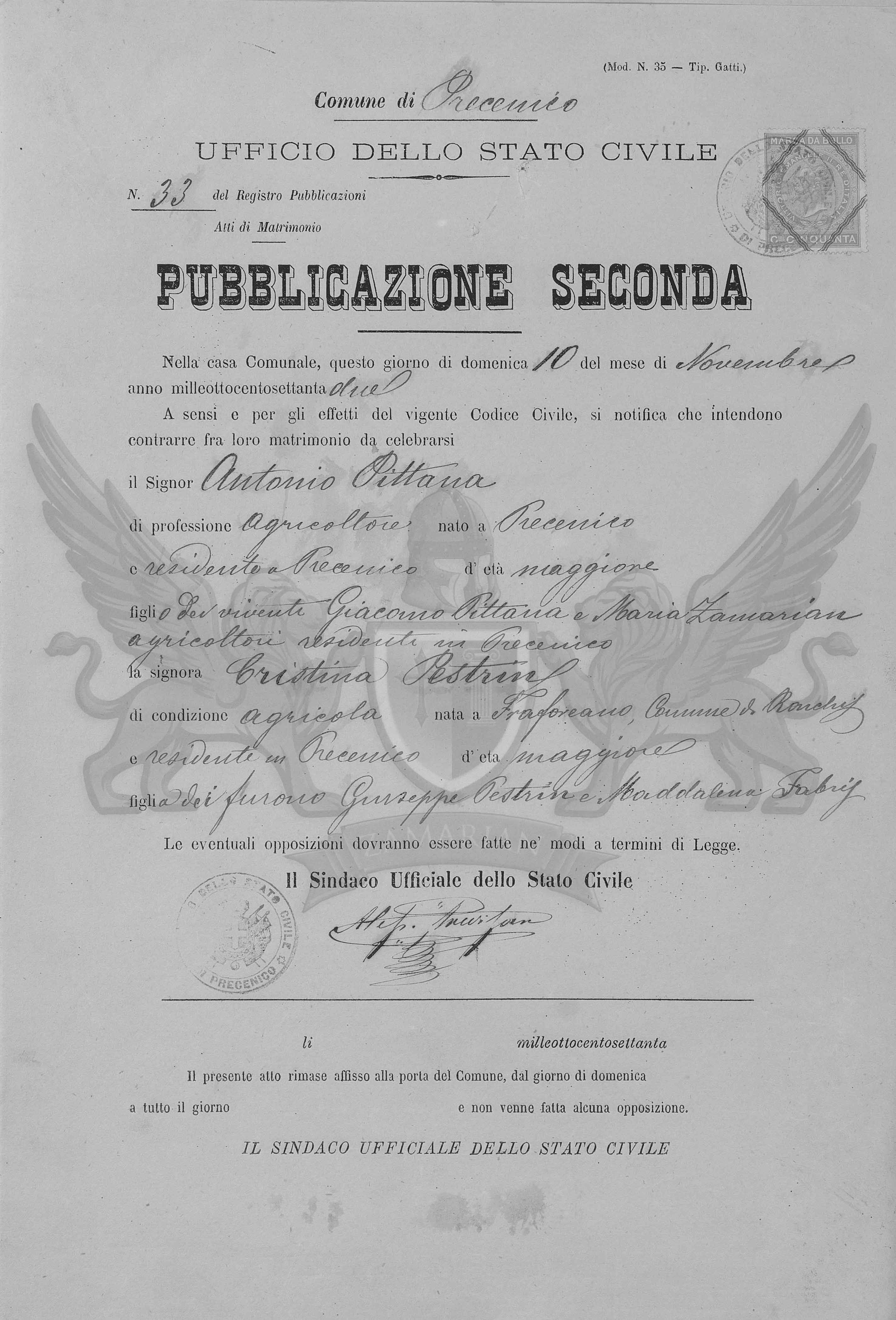 A sensos e pelos efeitos do vigente Código Civil, se notifica que ontem contrair matrimônio entre eles a celebrar neste Ofício o Senhor Antonio Pittana de profissão agricultor nascido em Precenicco, e residente em Precenicco, de idade maior, filho dos viventes Giacomo Pittana e de Maria Zamarian, agricultores, residentes em Precenicco e a Senhora Cristina Pestrin de condição agricultora, nascida em Fraforeano, Município de Ronchis, e residente em Precenicco, de idade maior, filha dos finados Giuseppe Pestrin e Maddalena Fabris.