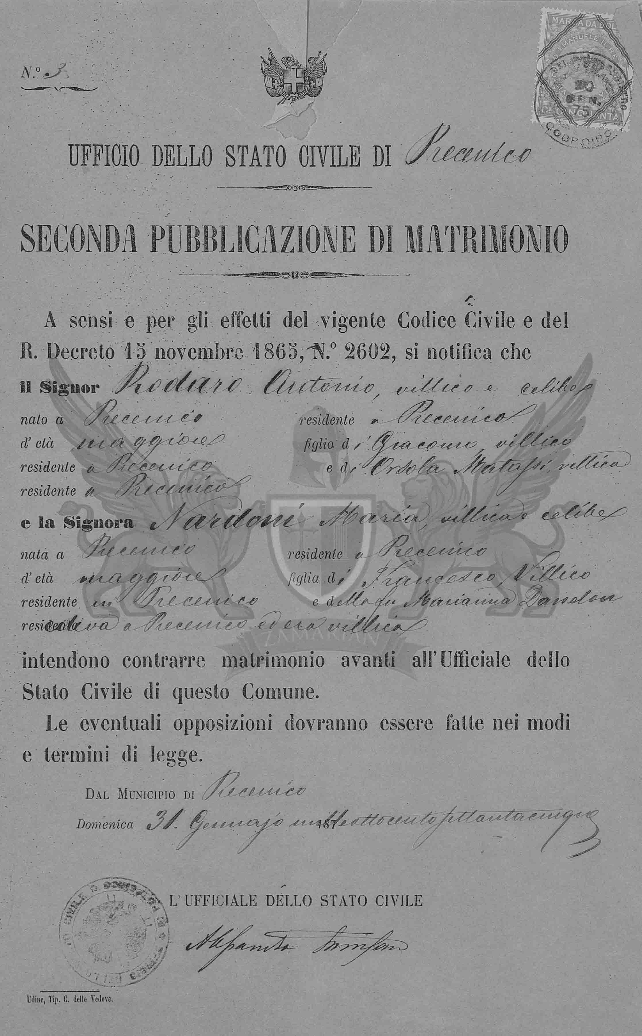 A sensos e pelos efeitos do vigente Código Civil e do Régio Decreto de 15 de novembro de 1865, N.º 2602, se notifica que o Senhor Rodaro Antonio, camponês e solteiro, nascido em Precenicco e residente em Precenicco, de idade maior, filho de Giacomo camponês e residente em Precenicco e Matassi Orsola, camponesa residente em Precenicco e a Senhora Nardoni Maria, camponesa e solteira, nascida em Precenicco e residente em Precenicco, de idade maior, filha de Francesco, camponês residente em Precenicco e da falecida Marianna Danelon residia em Precenicco e era camponesa intendem contrair matrimônio diante do Oficial do Estado Civil deste Município.