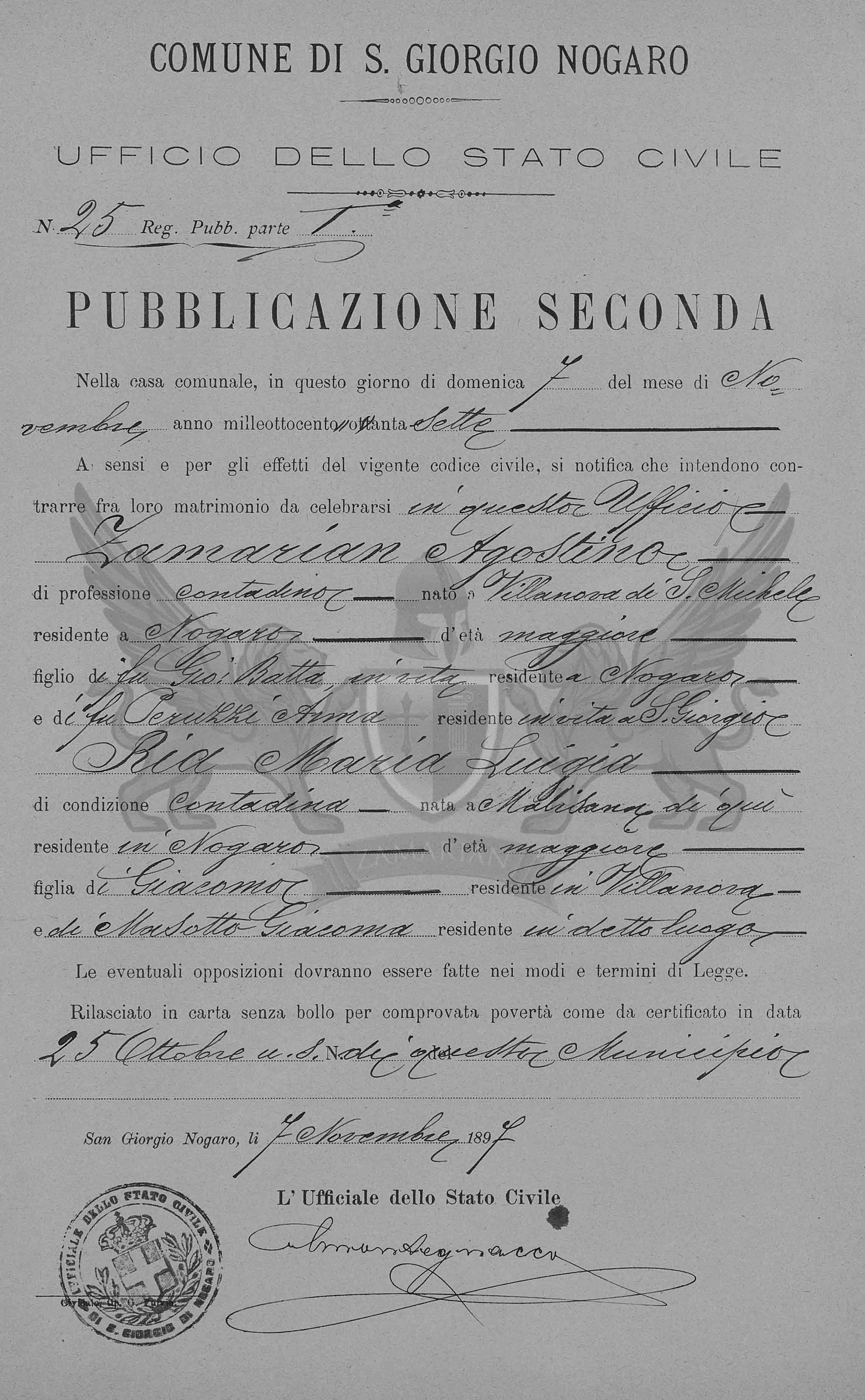A sensos e pelos efeitos do vigente Código Civil, se notifica que ontem contrair matrimônio entre eles a celebrar neste Ofício Zamarian Agostino de profissão camponês nascido em Villanova de San Michele, residente em Nogaro daqui de idade maior filho do falecido Giovanni Battista residente em vida em San Giorgio e da falecida Peruzzi Anna residente em vida em San Giorgio e Ria Maria Luigia de condição camponesa, nascida em Villanova daqui, residente em Nogaro, de idade maior, filha de Giacomo residente em Villanova e de Masotto Giacoma residente na citada.