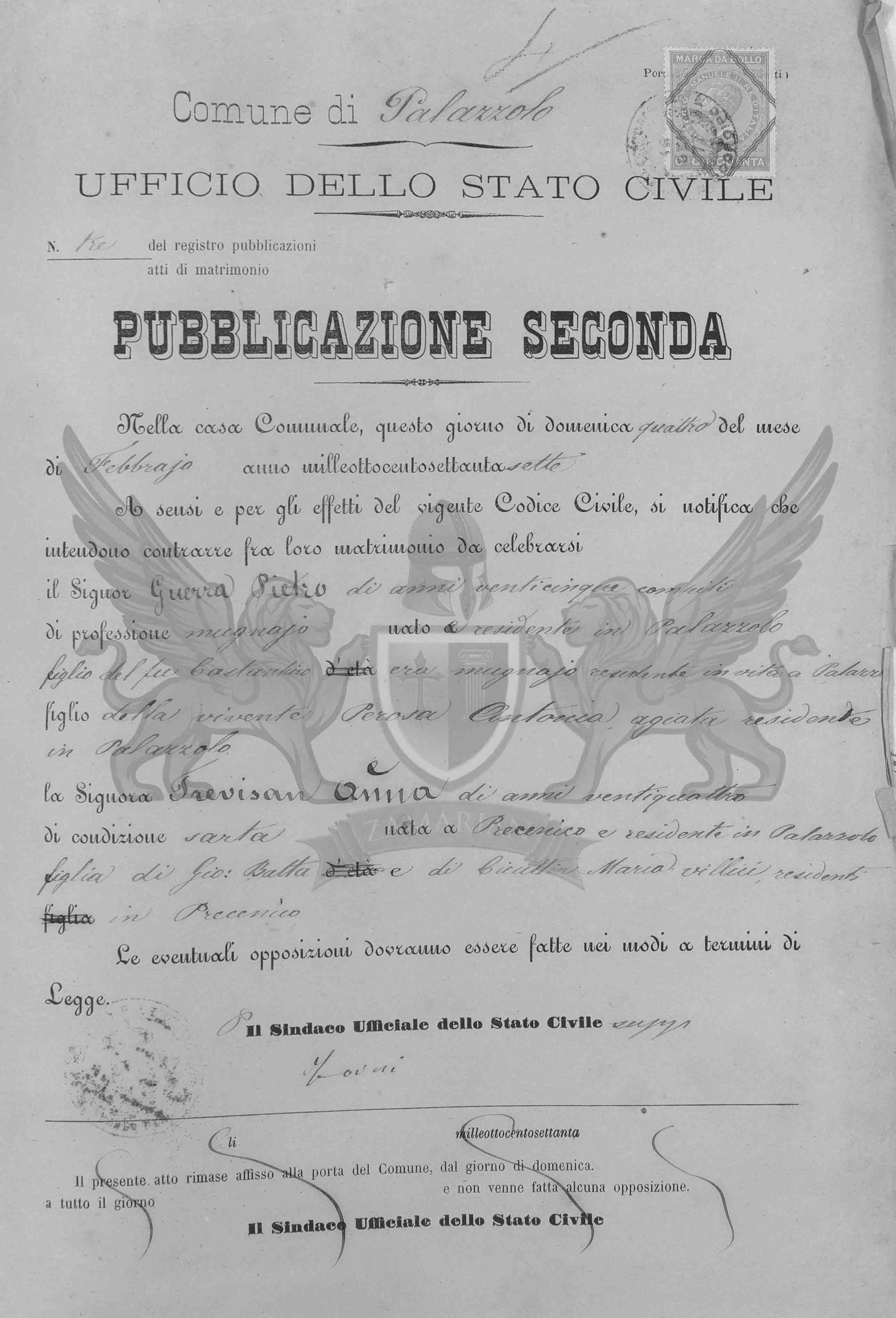 A sensos e pelos efeitos do vigente Código Civil se notifica que intendem contrair matrimônio a celebrar-se o Senhor Guerra Pietro de profissão moedor nascido e residente em Palazzolo de vinte e cinco anos completos filho do falecido Costantino, era moedor residente em vida em Palazzolo e da vivente Perosa Antonia comerciante residente em Palazzolo e a Senhora Trevisan Anna de vinte e quatro anos de condição artesã nascida em Precenicco e residente em Palazzolo filha de Giovanni Battista e de Ceccutin Maria camponeses residentes em Precenicco.