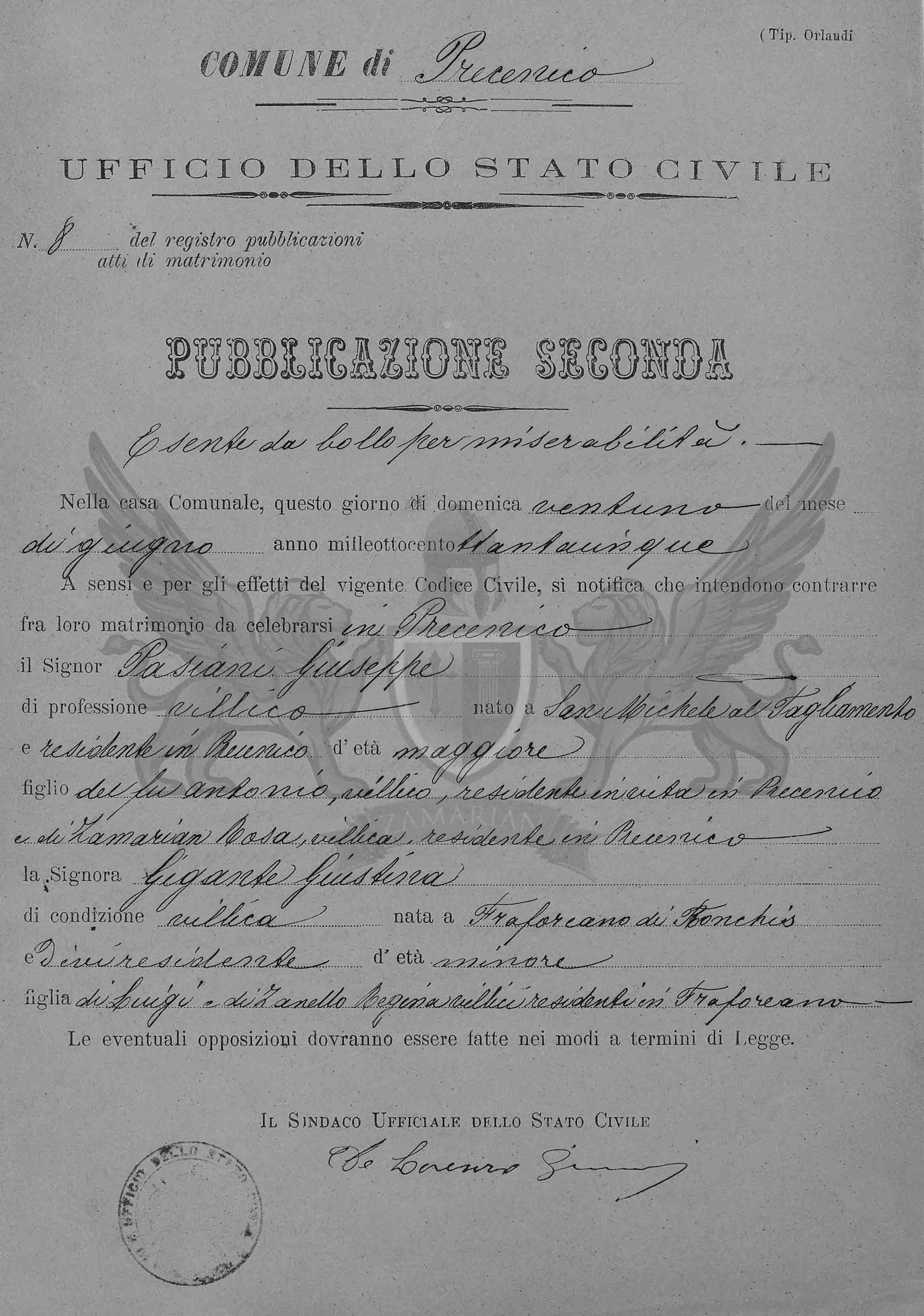A sensos e pelos efeitos do vigente Código Civil, notifica-se que intentem contrair entre eles matrimônio a celebrar-se em Precenicco o Senhor Pasian Giuseppe de profissão camponês, nascido em San Michele al Tagliamento e residente em Precenicco de idade maior, filho do falecido Antonio residente em vida em Precenicco, camponês e de Zamarian Rosa, camponesa, residente em Precenicco e a senhora Gigante Giustina de condição camponesa, nascida em Fraforeano de Ronchis e onde é residente, de idade maior, filha de Luigi e de Zanella Regina, camponeses, residentes em Fraforeano.
