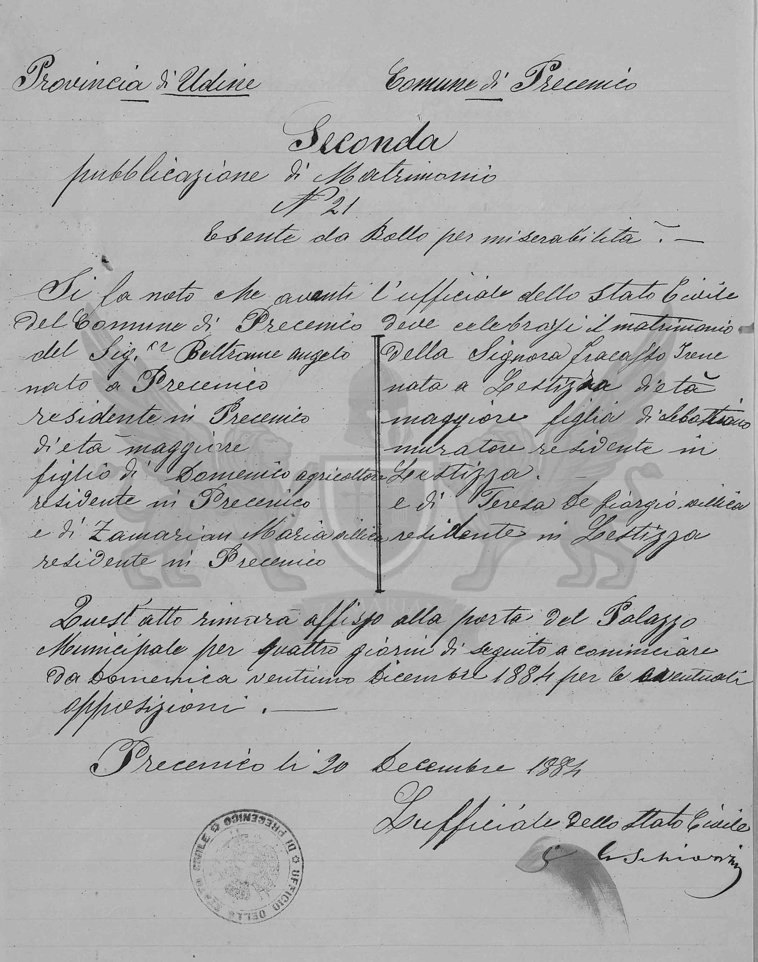 Se faz notório que diante do Oficial do Estado Civil do Município de Precenicco deve celebrar-se o matrimônio do Senhor Beltrame Angelo nascido em Precenicco, residente em Precenicco, de idade maior, filho de Domenico, agricultor, residente em Precenicco e de Zamarian Maria, camponesa, residente em Precenicco e da Senhora Fracasso Irene, nascida em Lestizza, residente em Lestizza, de idade maior, filha de Sebastiano, construtor e de Teresa De Giorgio, camponesa, residente em Lestizza.