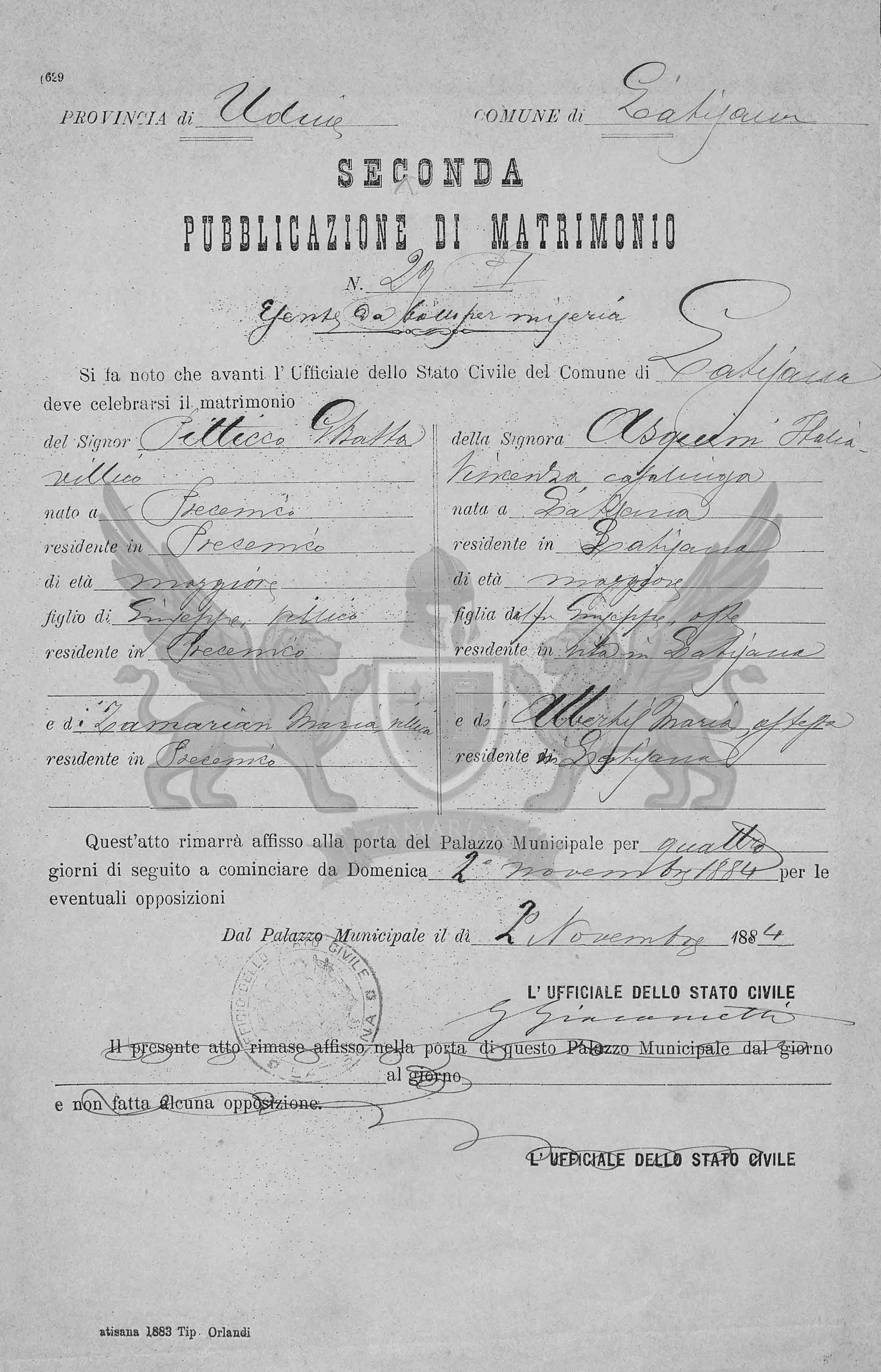 Se faz notório que diante do Oficial do Estado Civil do Município de Latisana deve celebrar-se o matrimônio do Senhor Piticco Giovanni Battista, camponês, nascido em Precenicco, residente em Precenicco, de idade maior, filho de Giuseppe, camponês, residente em Precenicco, e de Zamarian Maria, camponesa, residente em Precenicco, e da Senhora Asquini Italia Vincenza, dona de casa, nascida em Latisana, residente em Latisana, de idade maior, filha do falecido Giuseppe, garçom, residente em vida em Latisana e de Albertis Maria, garçonete residente em Latisana.