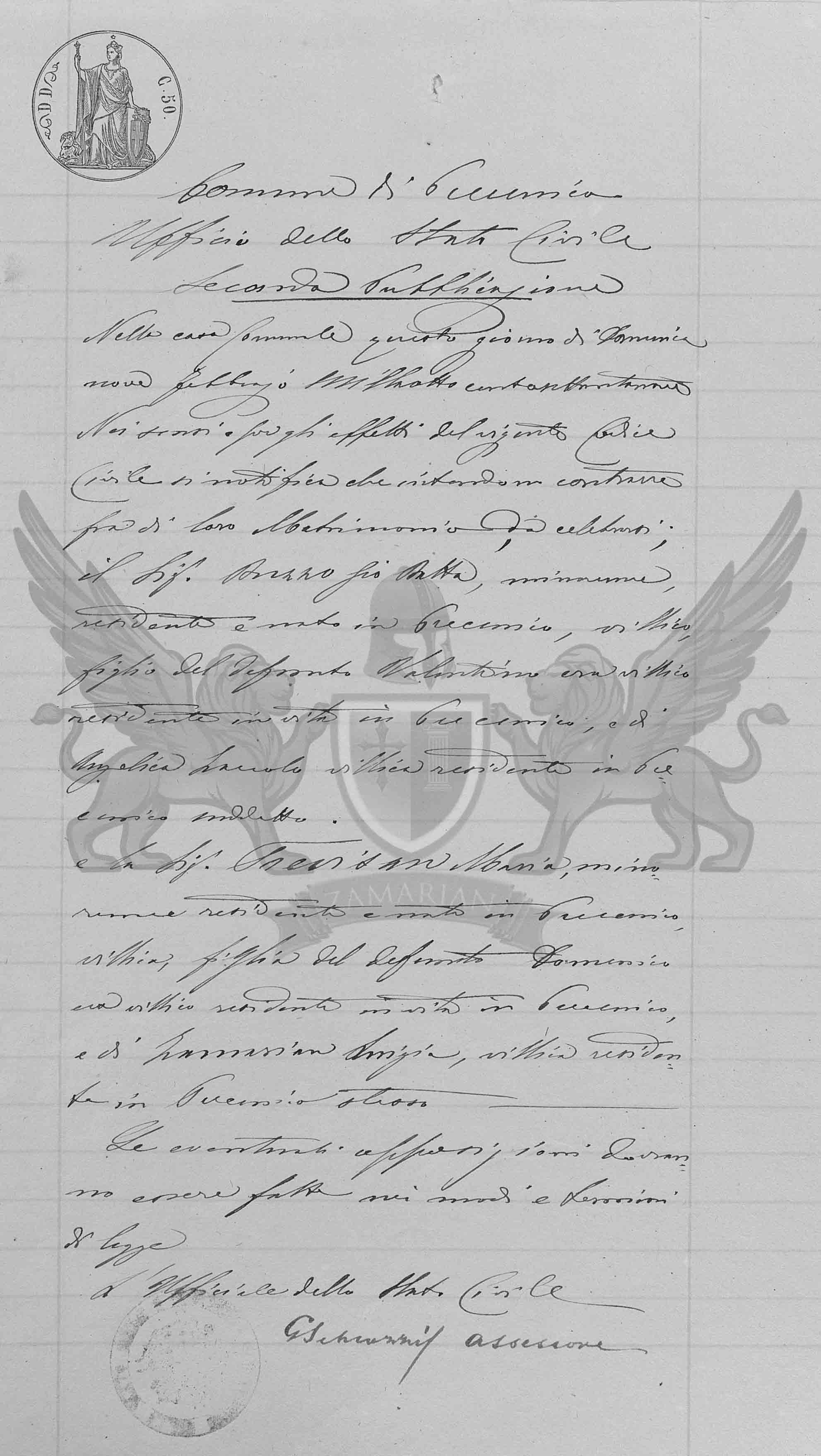 O Senhor Buzzo Giovanni Battista, menor de idade residente e nascido em Precenicco, camponês, filho do falecido Valentino, era, camponês, residente em vida em Precenicco e de Angelica Zoccolo camponesa residente em Precenicco.