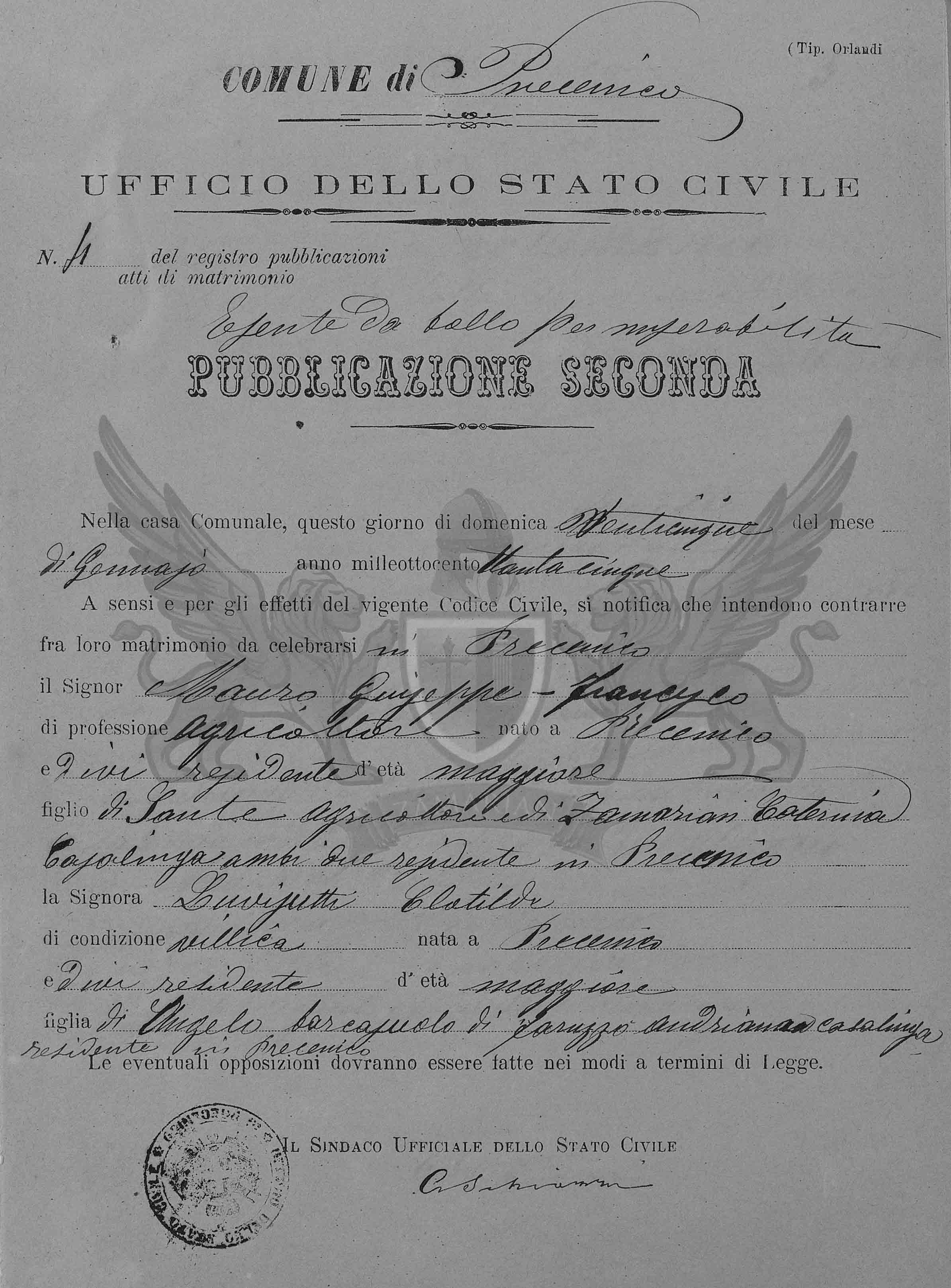 A sensos e pelos efeitos do vigente Código Civil, notifica-se que intentem contrair entre eles matrimônio a celebrar-se em Precenicco o Senhor Mauro Giuseppe de profissão agricultor, nascido em Precenicco e onde é residente de idade maior, filho de Sante, agricultor e de Zamarian Caterina, dona de casa, ambos os dois residentes em Precenicco e a senhora Luvisutti Clotilde de condição camponesa, nascida em Precenicco e onde é residente, de idade maior, filha de Angelo barqueiro e de Faruzzo Andriana, dona de casa, residentes em Precenicco.