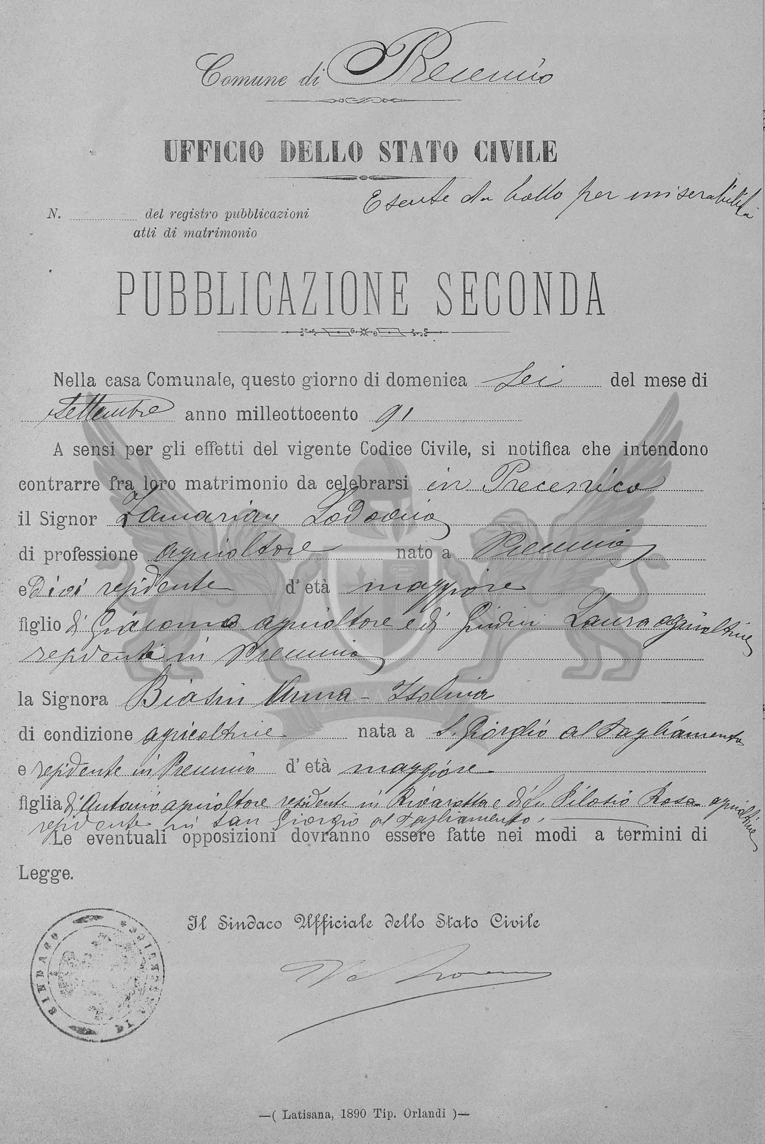 A sensos e para os efeitos do vigente Código Civil, se notifica que intendem contrair entre eles matrimônio a celebrar-se em Precenicco, o Senhor Zamarian Lodovico, de profissão agricultor, nascido em Precenicco, onde é residente, de idade maior, filho de Giacomo, agricultor e de Giudici Laura, agricultora, residentes em Precenicco, e a Senhora Biasin Anna Isolina de condição agricultora, nascida em San Giorgio al Tagliamento, residente em Precenicco, de idade maior, filha de Antonio, agricultor e da falecida Pilosio Rosa, agricultora, residente em vida em San Giorgio al Tagliamento.