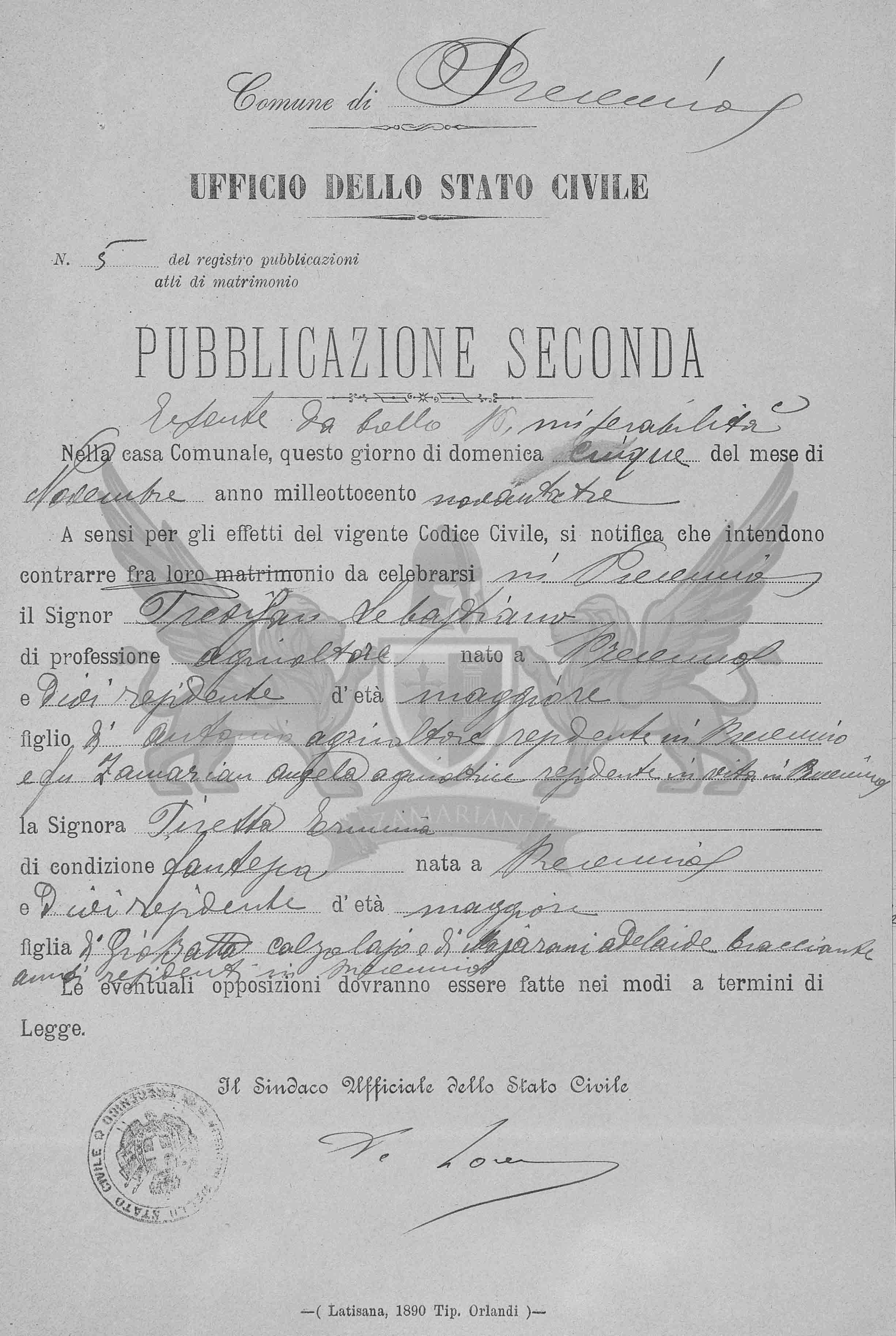 A sensos e para os efeitos do vigente Código Civil, se notifica que intendem contrair entre eles matrimônio a celebrar-se em Precenicco, o Senhor Trevisan Sebastiano, de profissão agricultor, nascido em Precenicco, onde é residente, de idade maior, filho de Antonio, agricultor, residente em Precenicco e da falecida Zamarian Angela, agricultora, residente em vida em Precenicco, e a Senhora Tiretta Erminia de condição cuidadora, nascida em Precenicco e onde é residente, de idade maior, filha de Giovanni Battista, sapateiro e de Majeroni Adelaide ajudante, residentes em Precenicco.