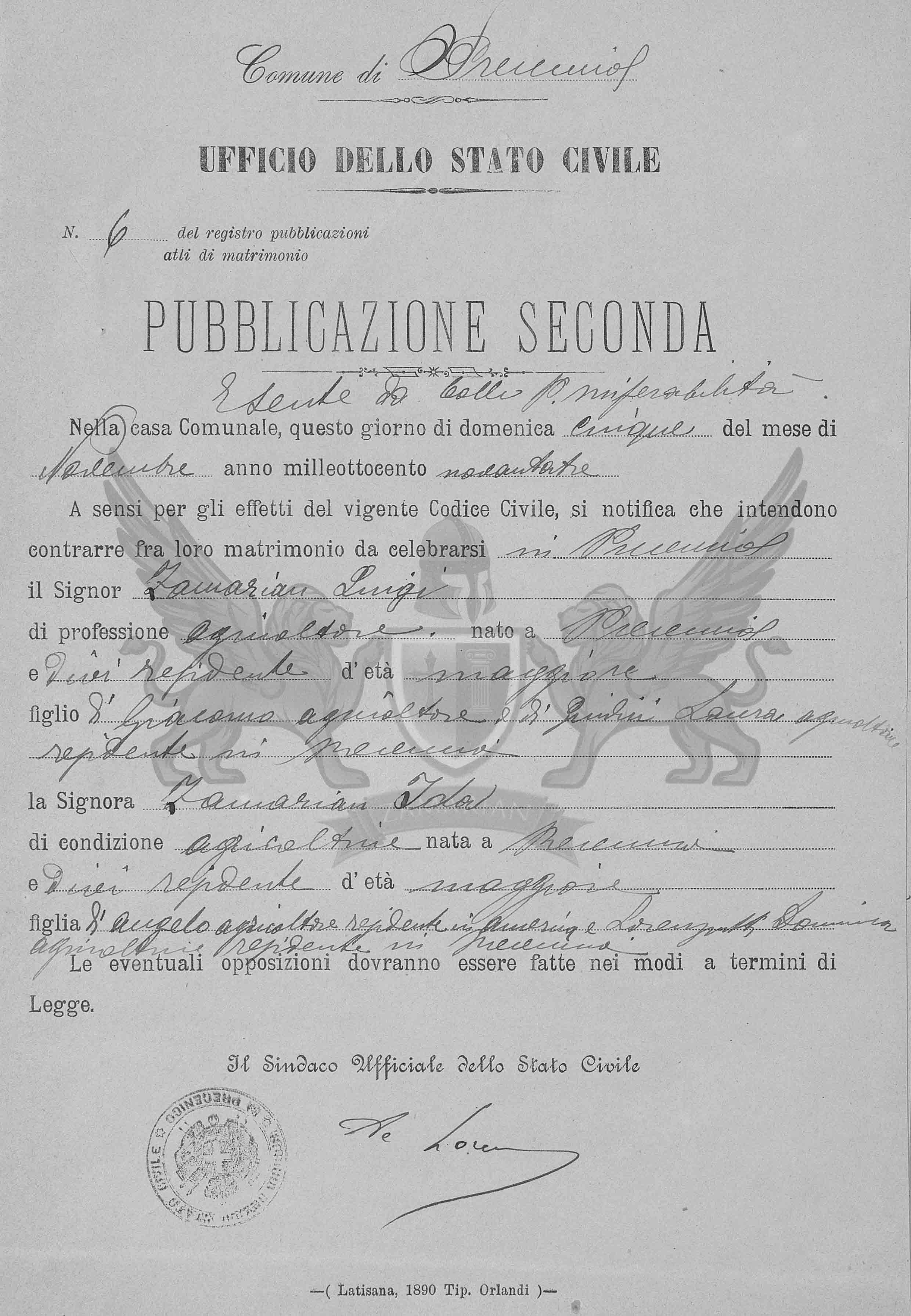 A sensos e para os efeitos do vigente Código Civil, se notifica que intendem contrair entre eles matrimônio a celebrar-se em Precenicco, o Senhor Zamarian Luigi, de profissão agricultor, nascido em Precenicco, onde é residente, de idade maior, filho de Giacomo, agricultor e de Giudici Laura, agricultora, residentes em Precenicco, e a Senhora Zamarian Ida de condição agricultora, nascida em Precenicco e aqui residente, de idade maior, filha de Angelo, agricultor, residente na America e de Bigatton Anna, agricultora, residente em Precenicco.