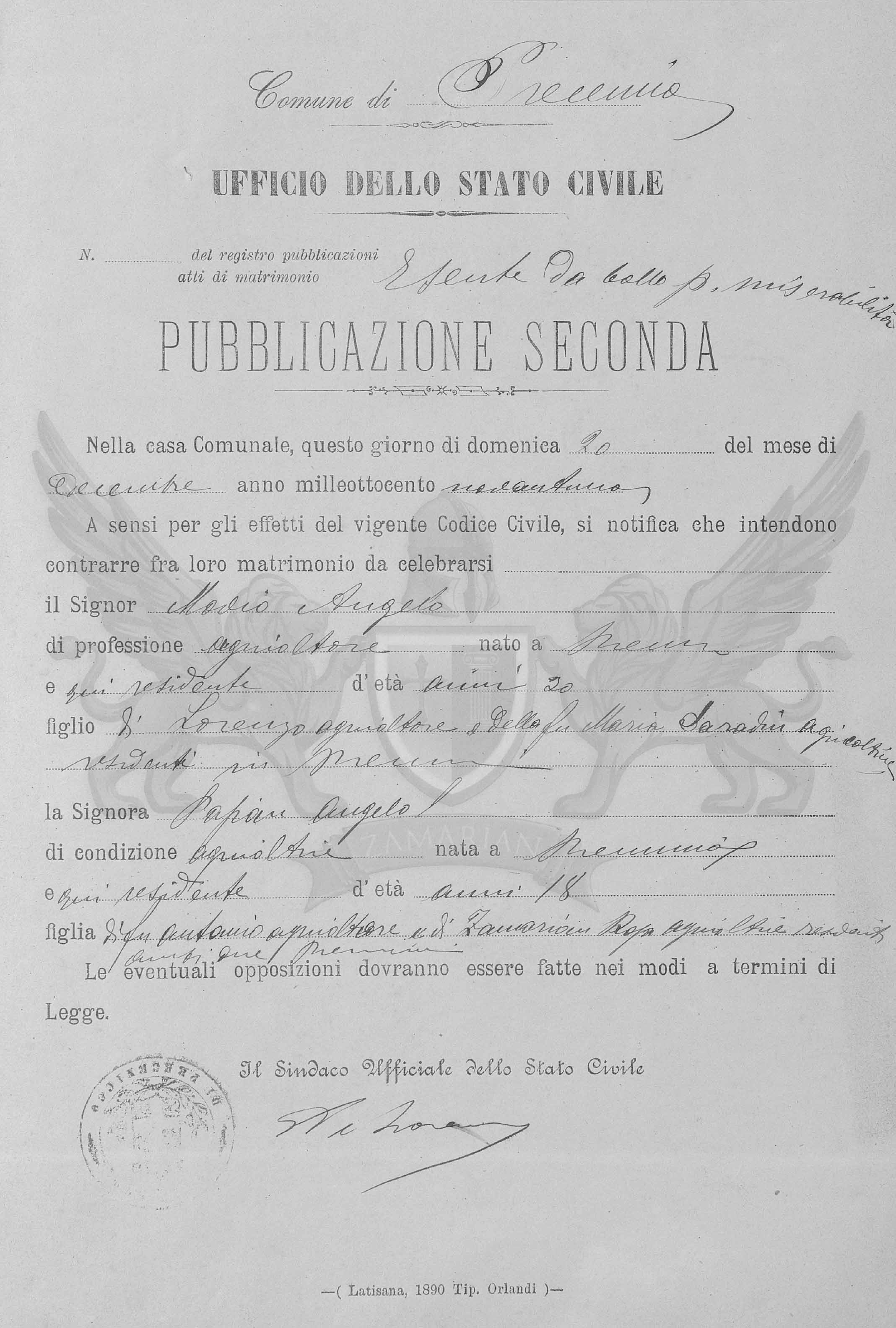 A sensos e pelos efeitos do vigente Código Civil, se notifica que ontem contrair matrimônio entre eles a celebrar neste Ofício o Senhor Movio Angelo de profissão agricultor nascido em Precenicco, e onde é residente, de idade de 20 anos, filho de Lorenzo, agricultor e da finada Maria Daradin, agricultora, residentes em Precenicco e a Senhora Pasian Angela de condição agricultora, nascida em Precenicco, onde é residente, de idade de 18 anos, filha do finado Antonio residente em vida em Precenicco e de Zamarian Rosa, residente em Precenicco, agricultora.