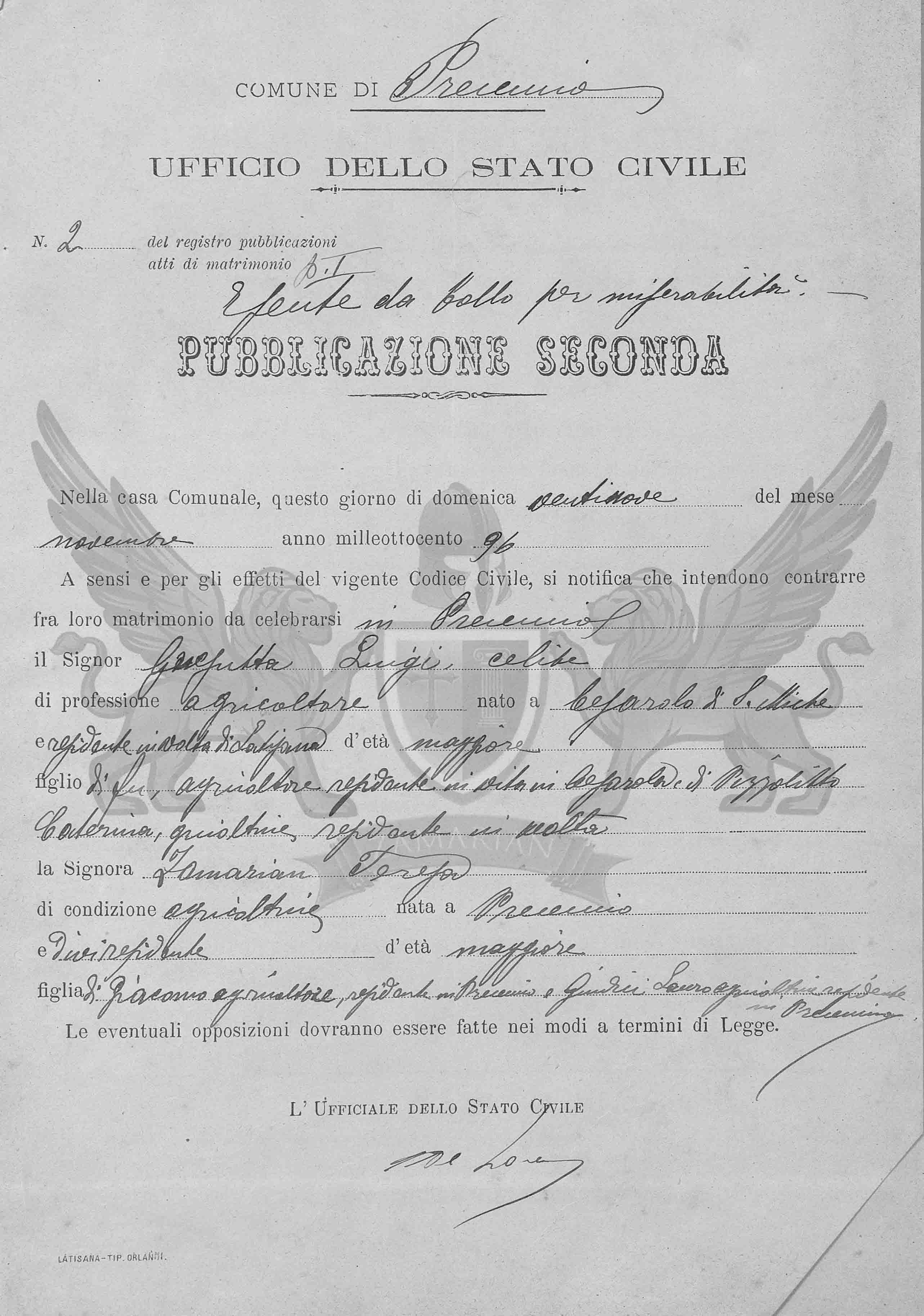 A sensos e pelos efeitos do vigente Código Civil, se notifica que ontem contrair matrimônio entre eles a celebrar em Precenicco o Senhor Gnesutta Luigi de profissão agricultor, nascido em Cesarolo de San Michele, residente em Volta de Latisana, de idade maior filho de Luigi, agricultor, residente em vida em Cesarolo e de Pizzolitto Caterina, residente em Volta e da Senhora Zamarian Teresa de condição agricultora, nascida em Precenicco, onde é residente, de idade maior, filha de Giacomo, agricultor, residente em Precenicco e de Giudici Laura, agricultora, residente em Precenicco.