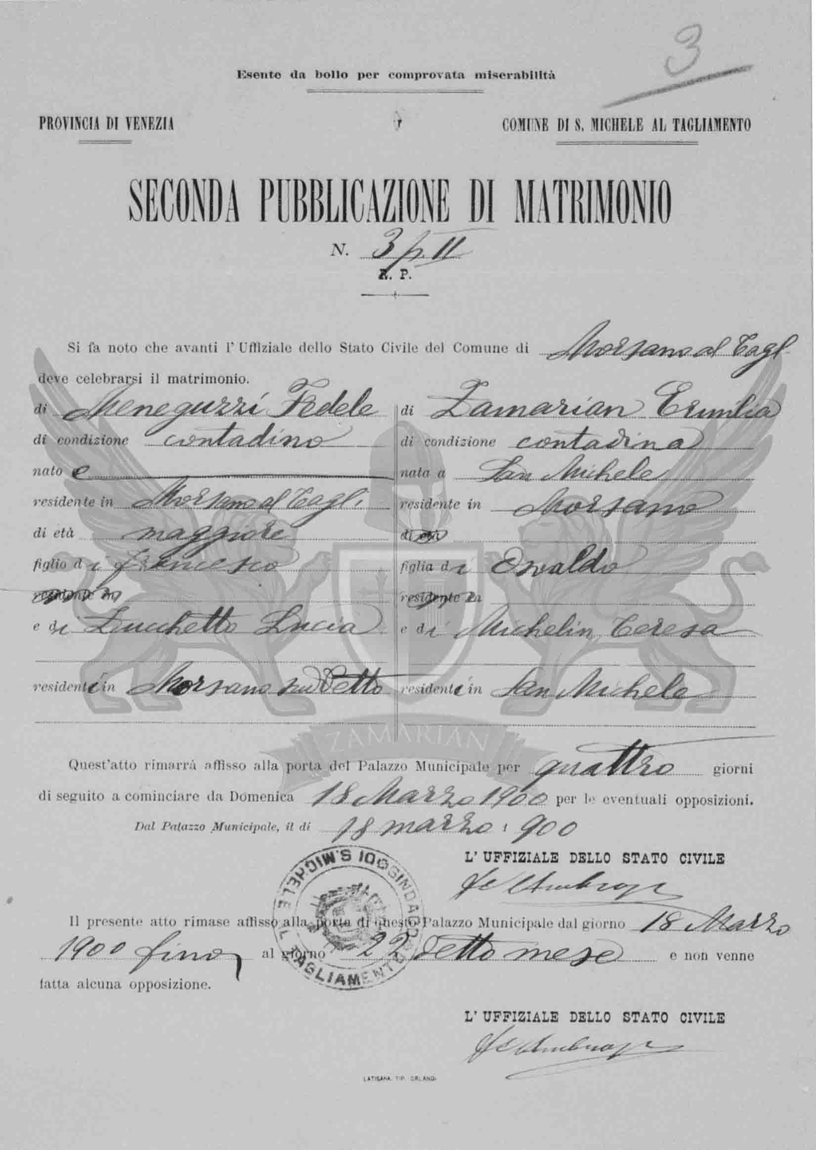 Se faz notório que diante do Oficial do Estado Civil do Município de Morsano al Taglimento deve celebrar-se o matrimônio de Meneguzzi Fedele de condição camponês nascido e residente em Morsano al Tagliamento de idade maior filho de Francesco e de Zucchetto Lucia residentes em Morsano supracitado e de Zamarian Ermilia de condição camponesa nascida em San Michele al Tagliamento, residente em Morsano, filha de Osvaldo e de Michelin Teresa, residentes em San Michele al Tagliamento.