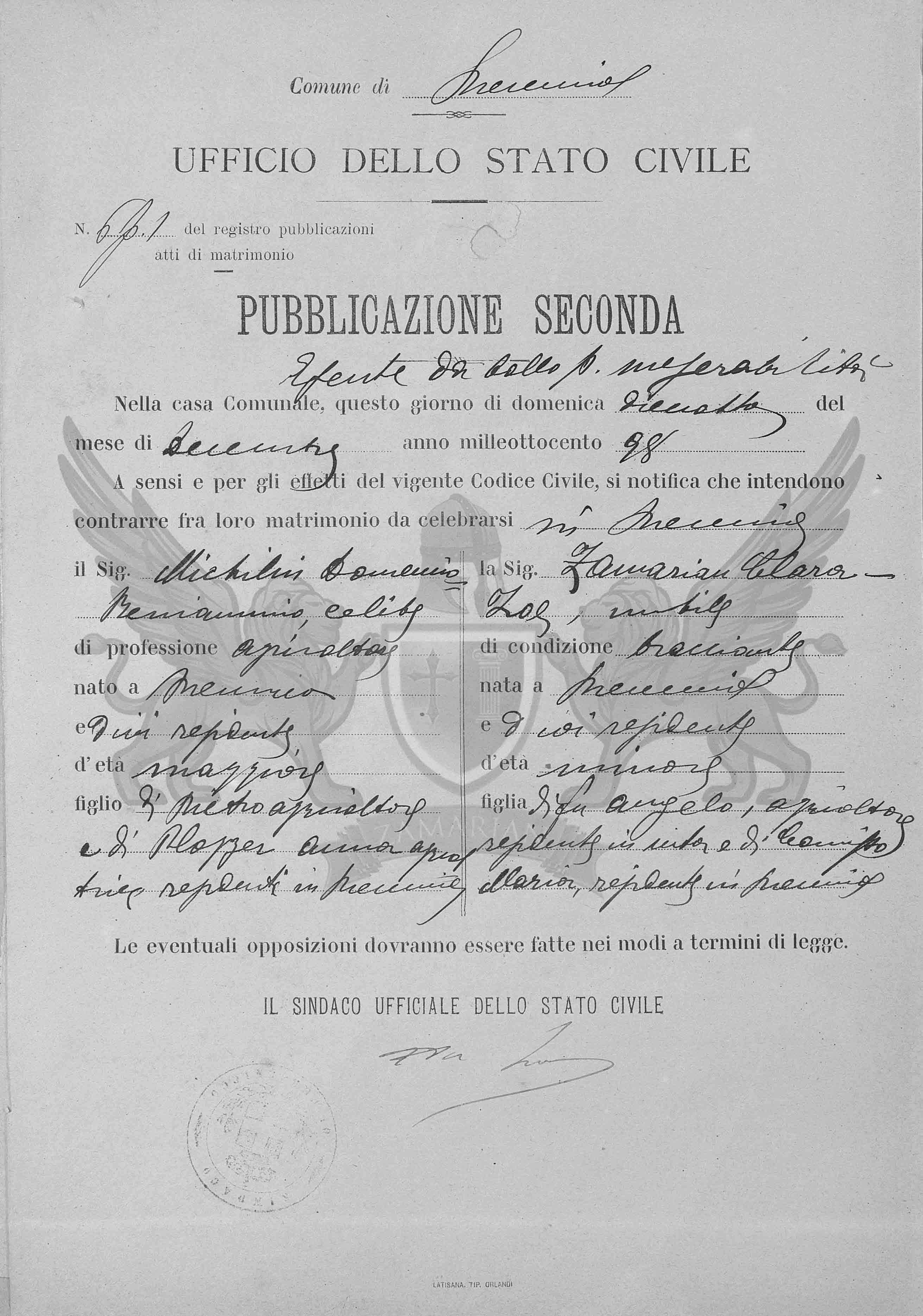 A sensos e pelos efeitos do vigente Código Civil, se notifica que ontem contrair matrimônio entre eles a celebrar em Precenicco o Senhor Michelin Domenico, solteiro de profissão agricultor, nascido em Precenicco, e onde é residente, de idade maior, filho de Pietro, agricultor e de Plozzer Anna, agricultora, residentes em Precenicco e a Senhora Zamarian Clara Zoe, solteira de condição ajudante, nascida em Precenicco, e onde é residente, de idade menor, filha do falecido Angelo, agricultor, residente em vida em Precenicco e de Comisso Maria, residente em Precenicco.