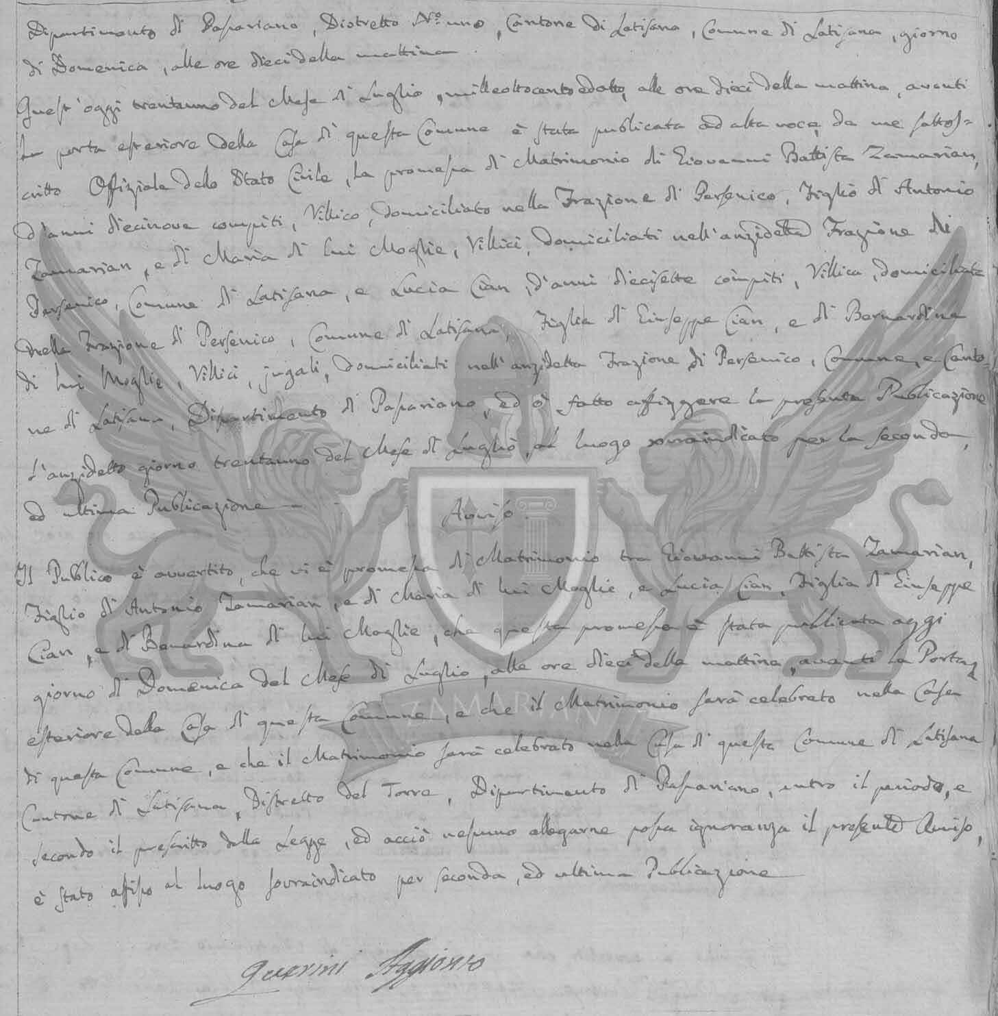 O público foi advertido que a promessa de Matrimônio entre Gio: Batta Zamarian filho de Antonio Zamarian, e de Maria sua Mulher e Lucia Cian filha de Giuseppe Cian, e de Bernardina sua mulher, que esta promessa foi publicada hoje dia de Domingo do mês de Julho, às dez horas da manhã, diante à porta exterior da Casa deste Município, e que o Matrimônio será celebrado na Casa deste Município de Latisana, Cantão de Latisana, Distrito del Torre, Departamento de Passariano, entre o período, e segundo o prescrito pela Lei, e a isto ninguém possa alegar ignorância o presente Aviso, foi fixado no local supra indicado pela segunda, e última Publicação.