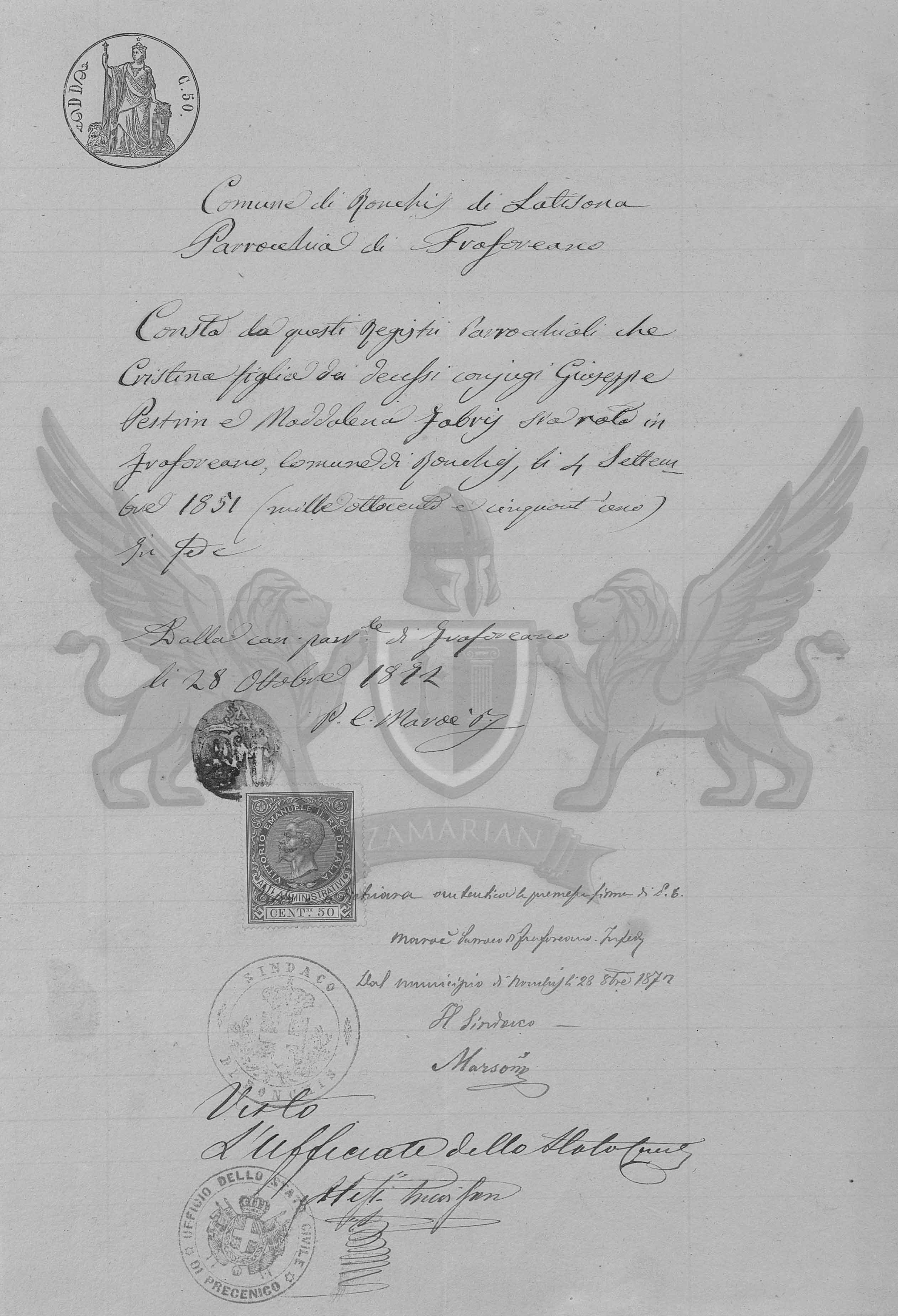 Consta destes Registros Paroquiais que Cristina filha dos falecidos cônjuges Giuseppe Pestrin e Maddalena Fabris seja nascida em Fraforeano, Município de Ronchis, dia 4 de Setembro de 1851 / mil oitocentos e cinquenta e um.