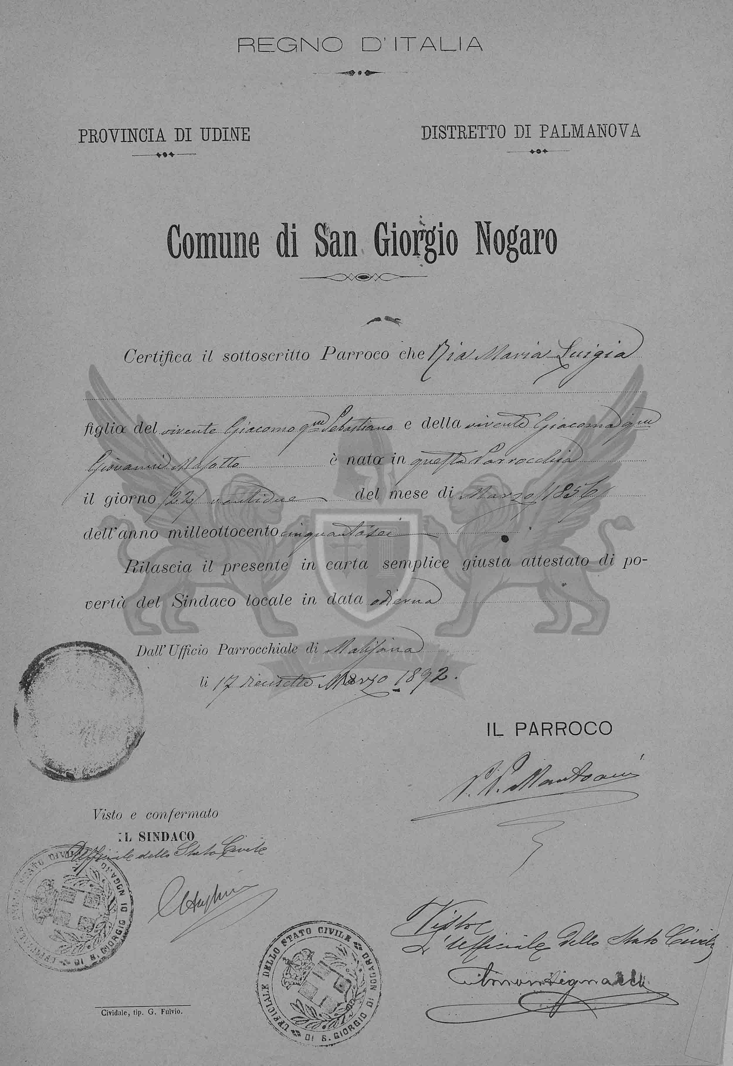 Certifica o subscrito Pároco que Ria Maria Luigia filha do vivente Giacomo filho do falecido Sebastiano e da vivente Giacoma filha do falecido Giovanni Masotto nasceu nesta Paróquia no dia 22 /vinte e dois/ do mês de março do ano de mil oitocentos e cinquenta e seis.