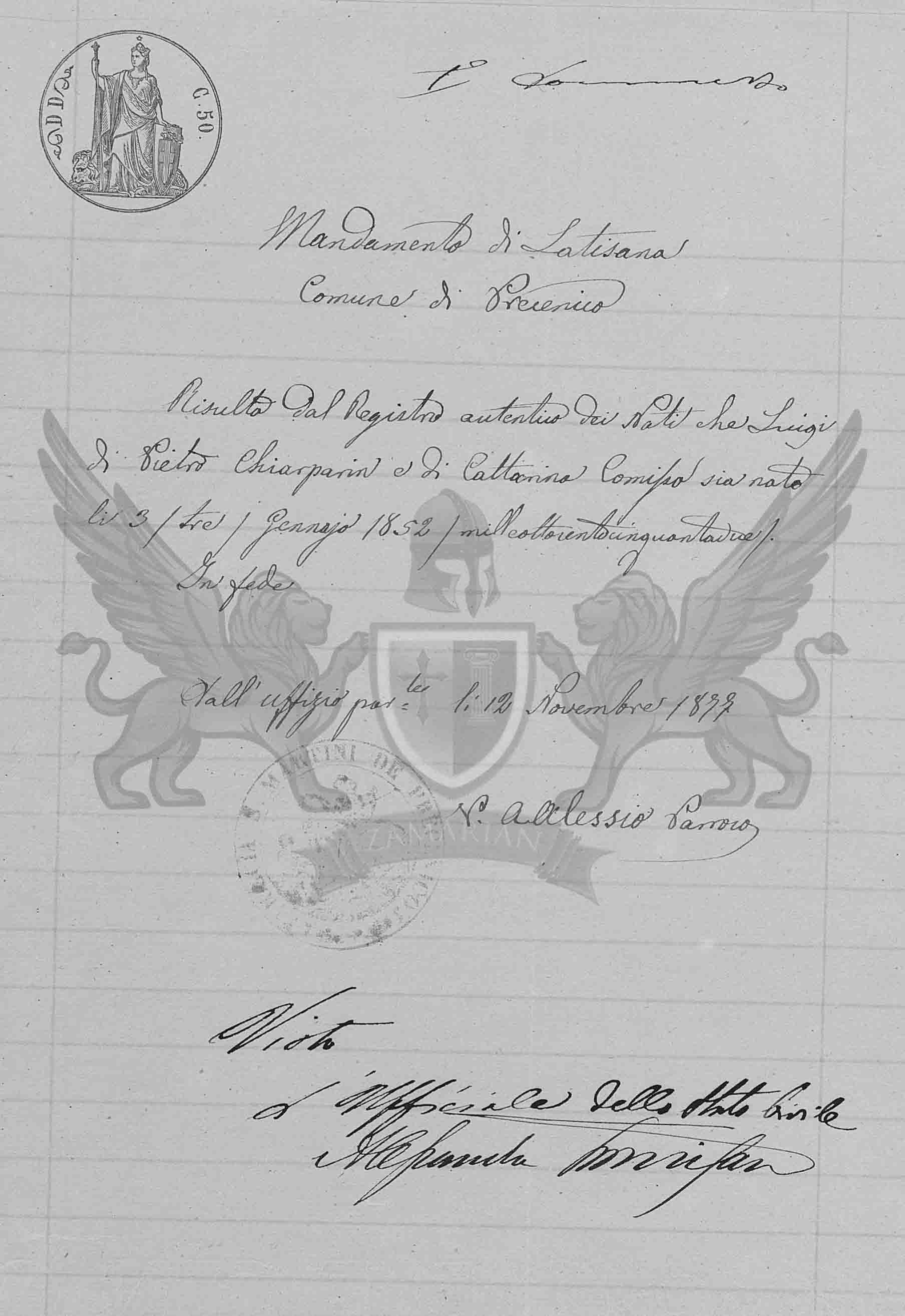 Resulta do registro autêntico dos nascidos que Luigi filho de Pietro Chiarparin e de Catterina Comisso nasceu dia 3 /três/ de Janeiro de 1852 /mil oitocentos e cinquenta e dois/.