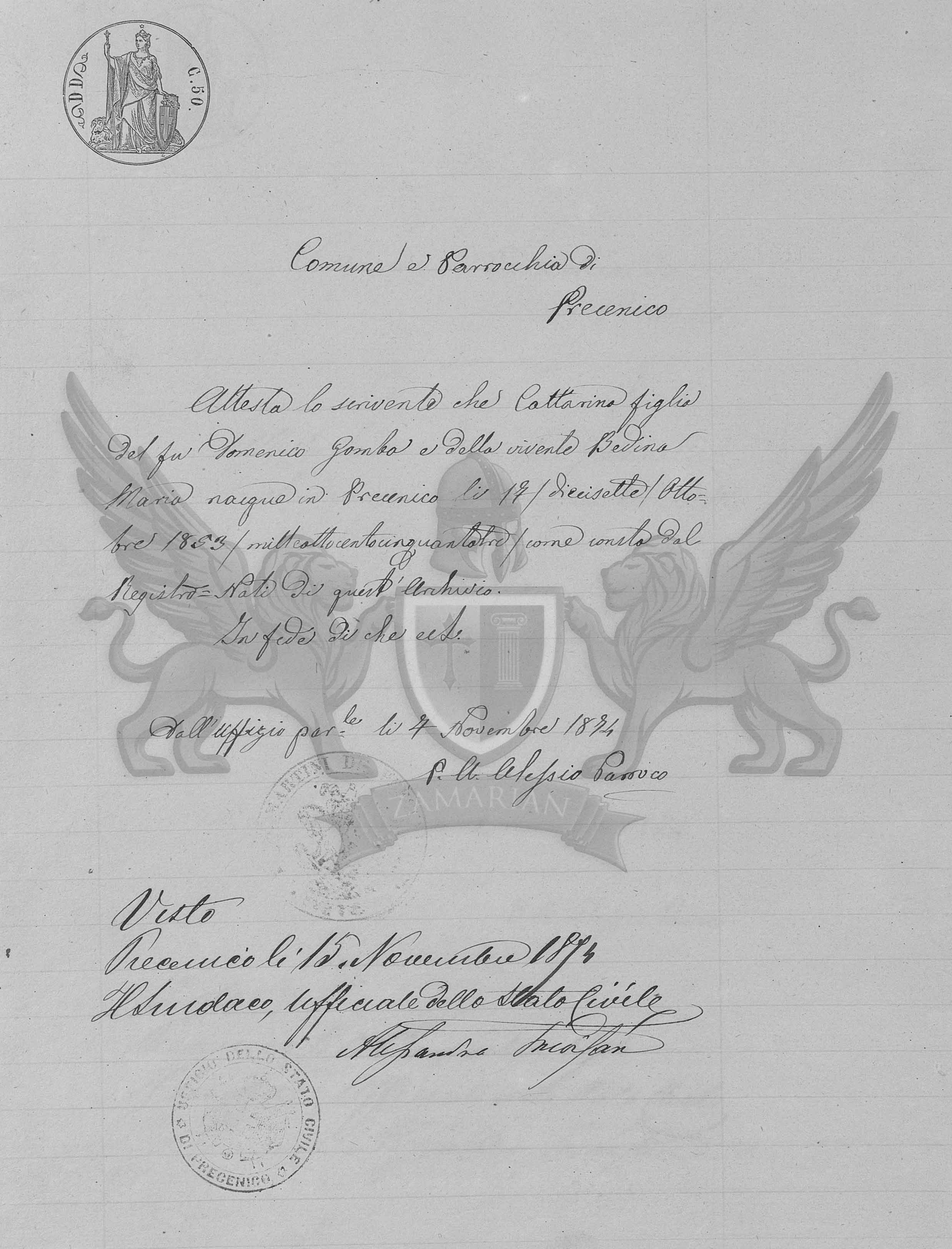 Atesta o escrevente que Cattarina filha do falecido Domenico Gomba e da vivente Bedina Maria nasce em Precenicco dia 17 /dezessete / de Outubro de 1853 mil oitocentos e cinquenta e três/ como consta do Registro de Nascimentos deste Arquivo.