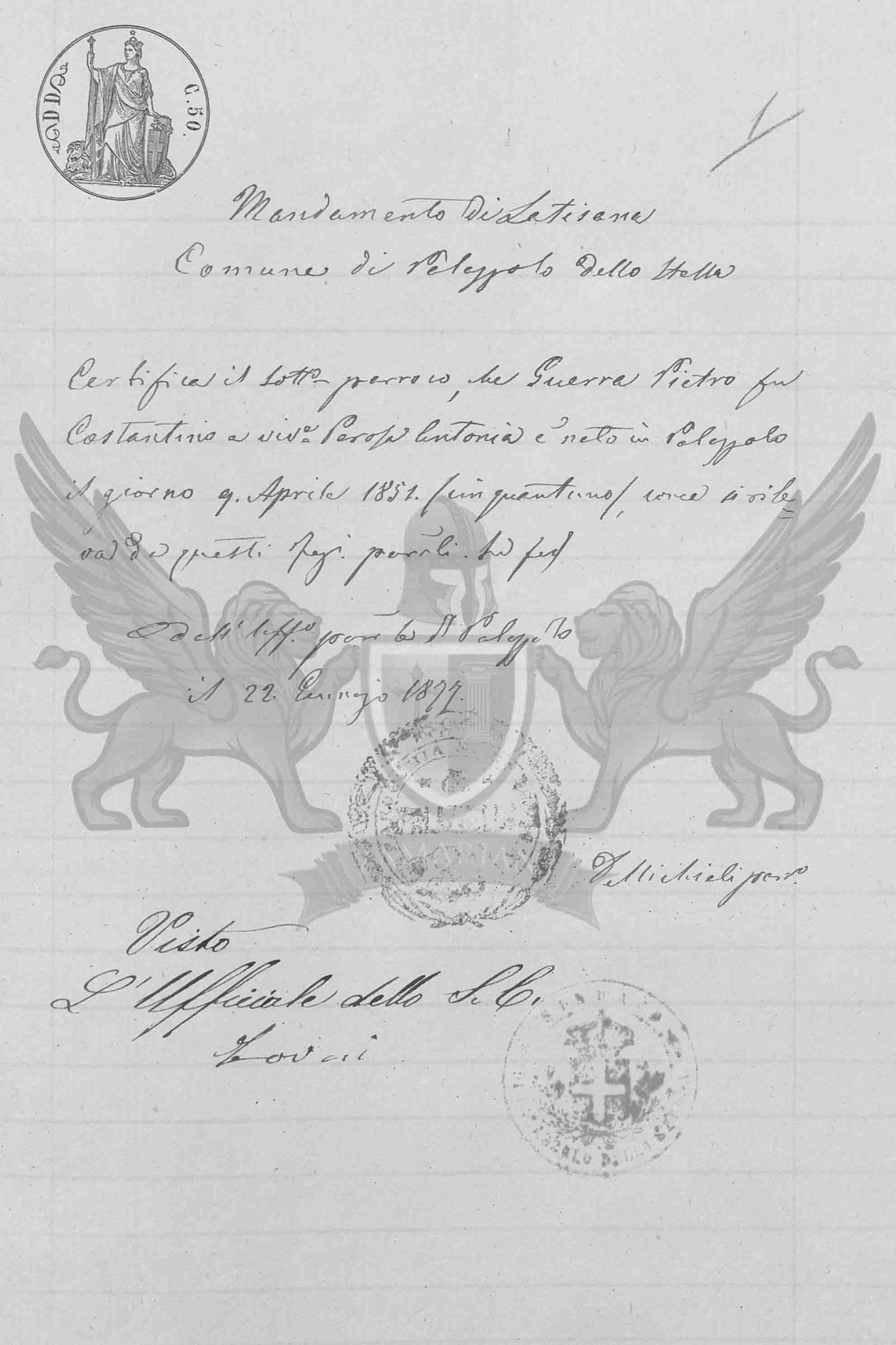 Certifica o subscrito pároco, que Guerra Pietro filho do falecido Costantino e da vivente Perosa Antonia nasceu em Palazzolo no dia 9 de abril de 1851 /cinquenta e um/, como consta destes Registros paroquiais. Em fé