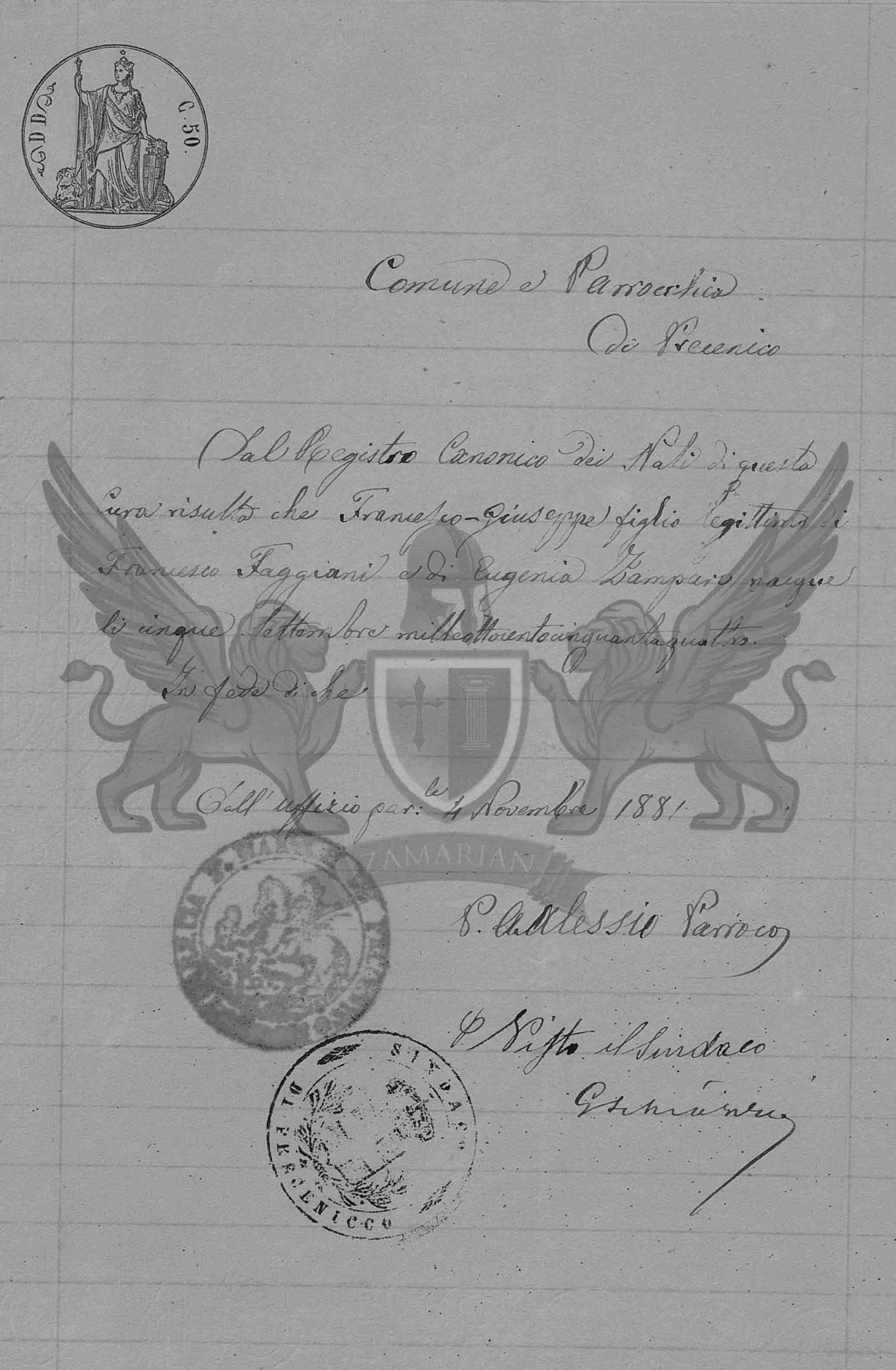 Do Registro Canônico dos Nascidos desta Paróquia resulta que Francesco-Giuseppe filho legítimo de Francesco Faggiani e de Eugenia Zamparo nasce dia cinco de setembro de mil oitocentos e cinquenta e quatro.