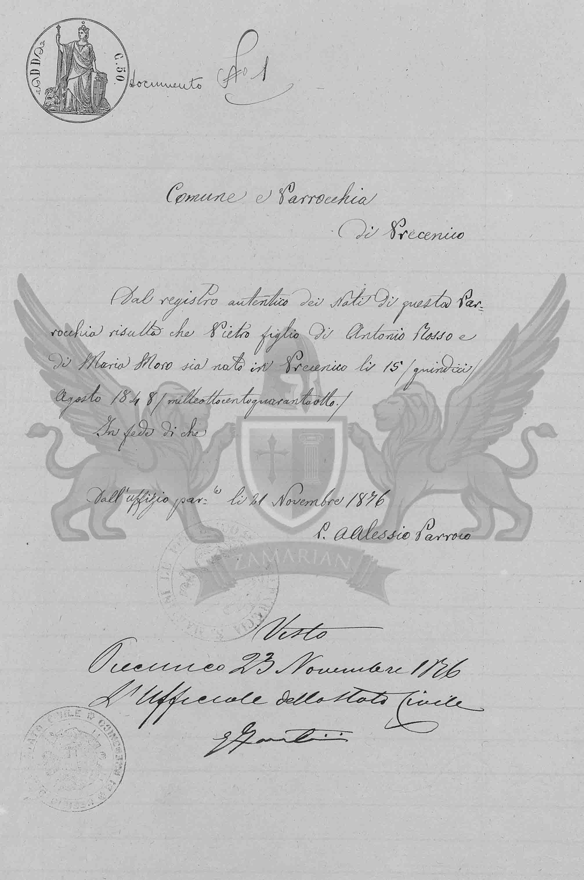 Do registro autêntico dos Nascidos desta Paróquia resulta que Pietro filho de Antonio Rosso e de Maria Moro nasceu em Precenicco dia 15 /quinze/ de Agosto de 1848 /mil oitocentos e quarenta e oito/.