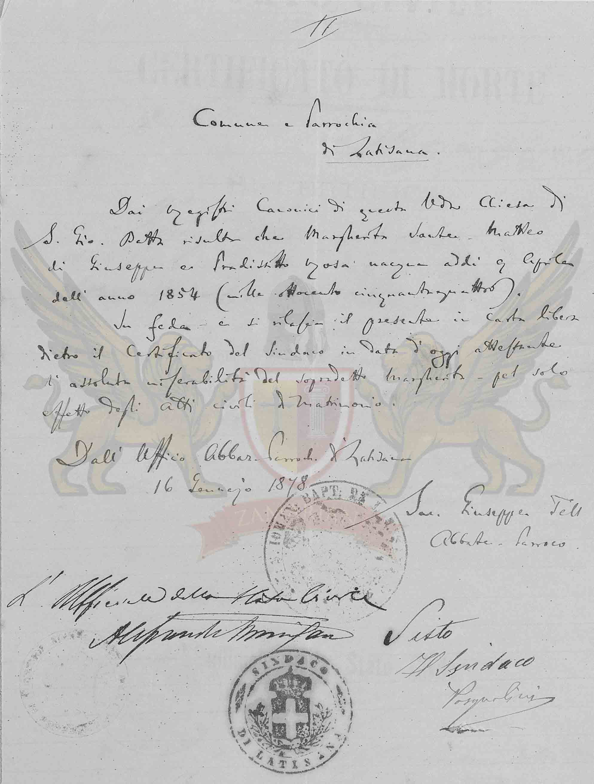 Dos registros Canônicos desta Igreja de San Giovanni Battista resulta que Margherita Sante-Matteo e Pradissatto Rosa nasce ao dia 9 de Abril do ano de 1854 (mil oitocentos e cinquenta e quatro). Em fé e se emite em carta livre diante do certificado despachado pelo Síndico em data de hoje diante da absoluta miserabilidade do supra citado Margherita. Apenas atesto para fins de matrimônio.
