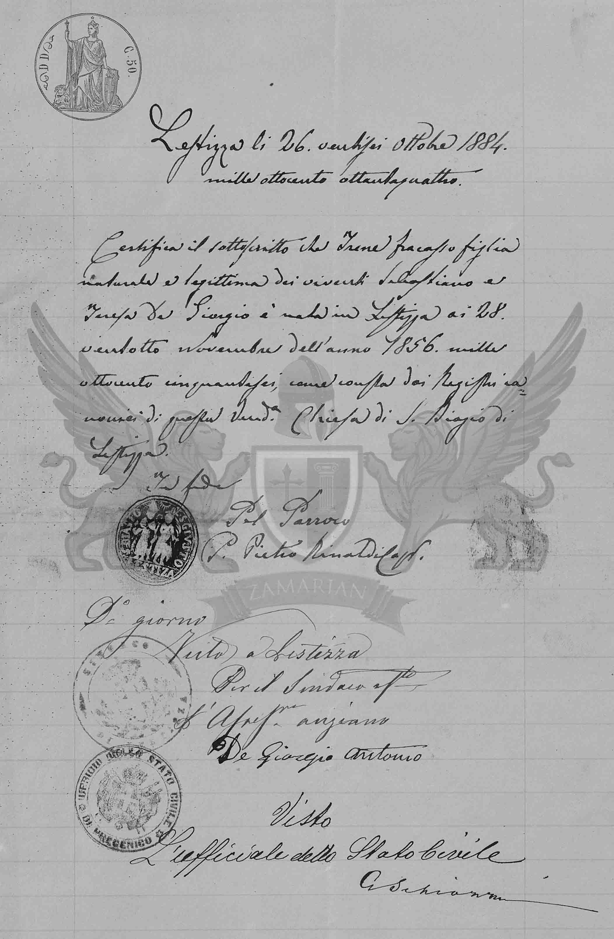 Certifica o subscrito que Irene Fracasso filha natural e legítima dos viventes Sebastiano e Teresa De Giorgio nasceu em Lestizza aos 28 vinte e oito de Novembro do ano de 1856 mil oitocentos e cinquenta e seis, como consta dos Registros canônicos desta Venerada Igreja de San Biagio de Lestizza.