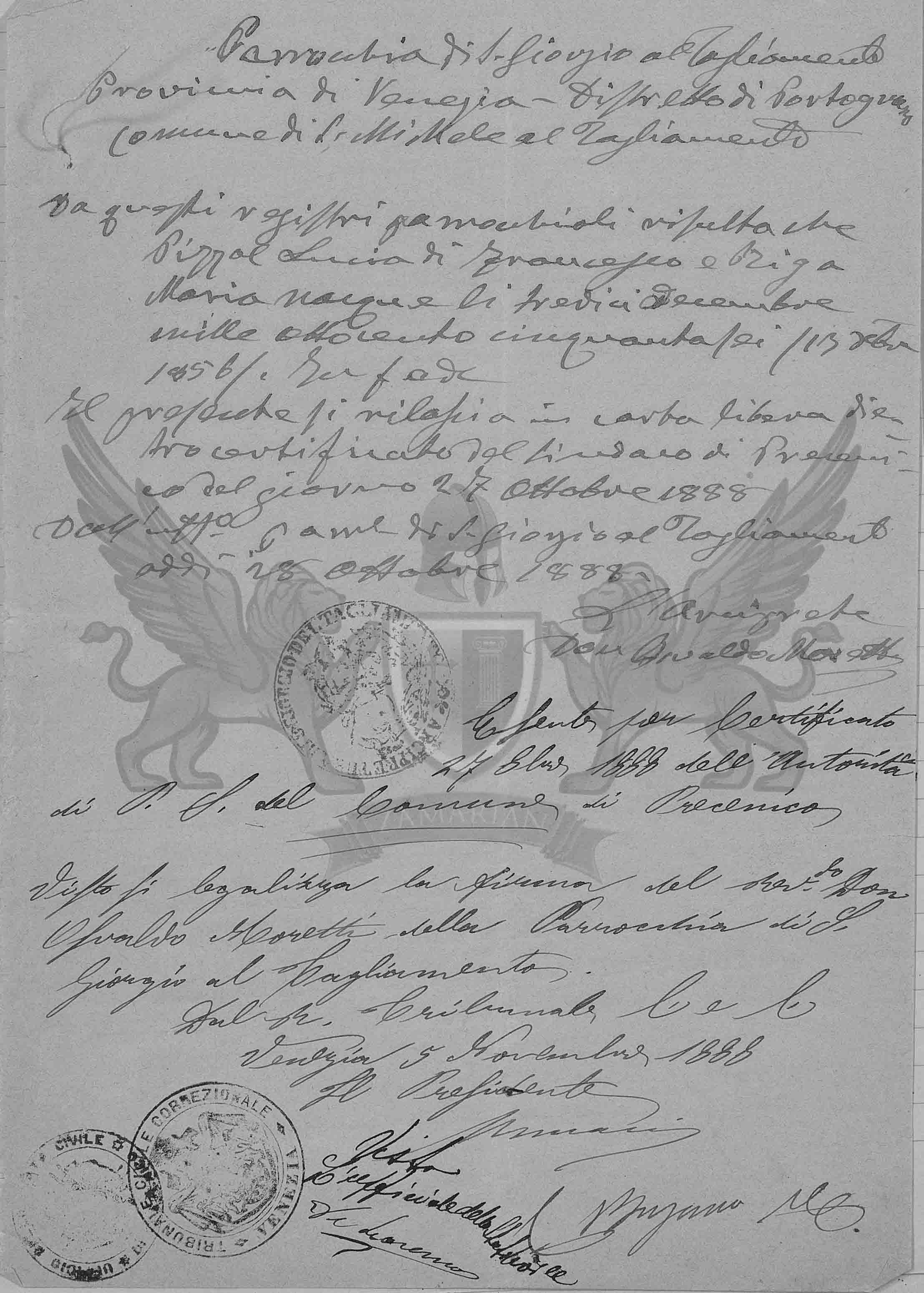 O presente se emite em papel livre através do certificado do Síndico de Precenicco do dia 27 de Outubro de 1888.