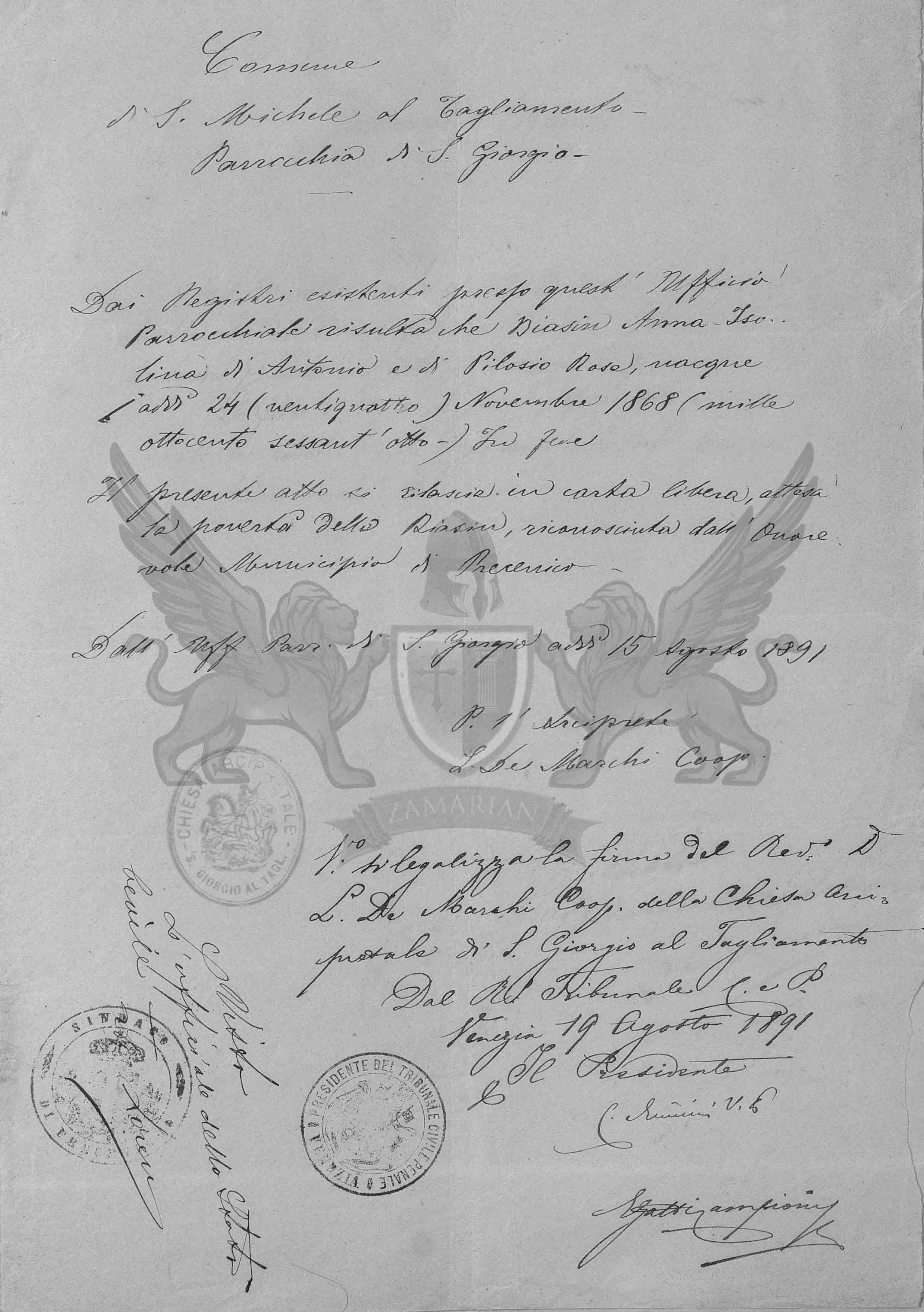 Visto legalizo a assinatura do Reverendo Don L. De Marchi Capelão da igreja e Cúria de San Giorgio al Tagliamento.