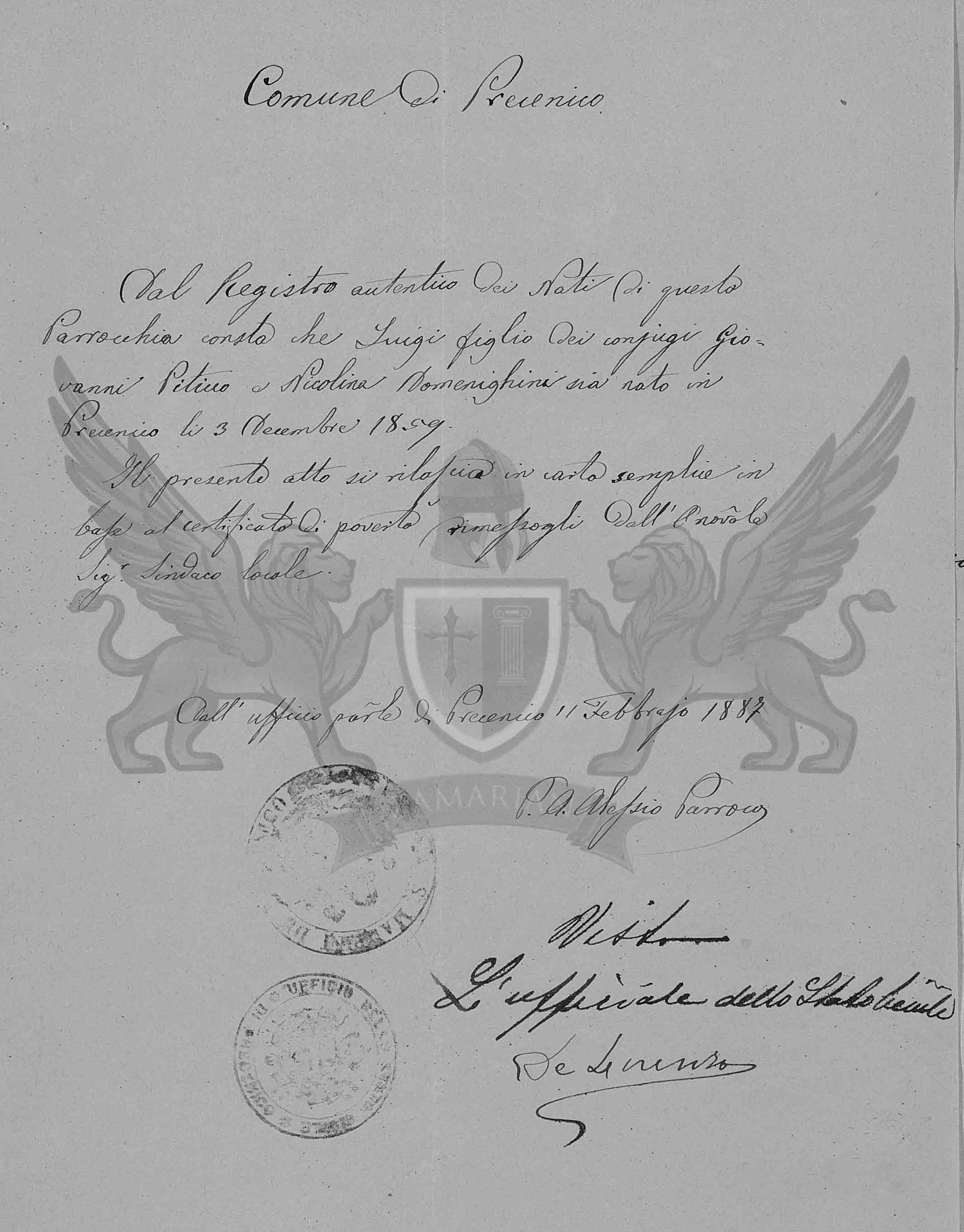 Do Registro autêntico dos Nascidos desta Paróquia consta que Luigi filho dos cônjuges Giovanni Piticco e Nicolina Domenighini seja nascido em Precenicco dia 3 de dezembro de 1859.