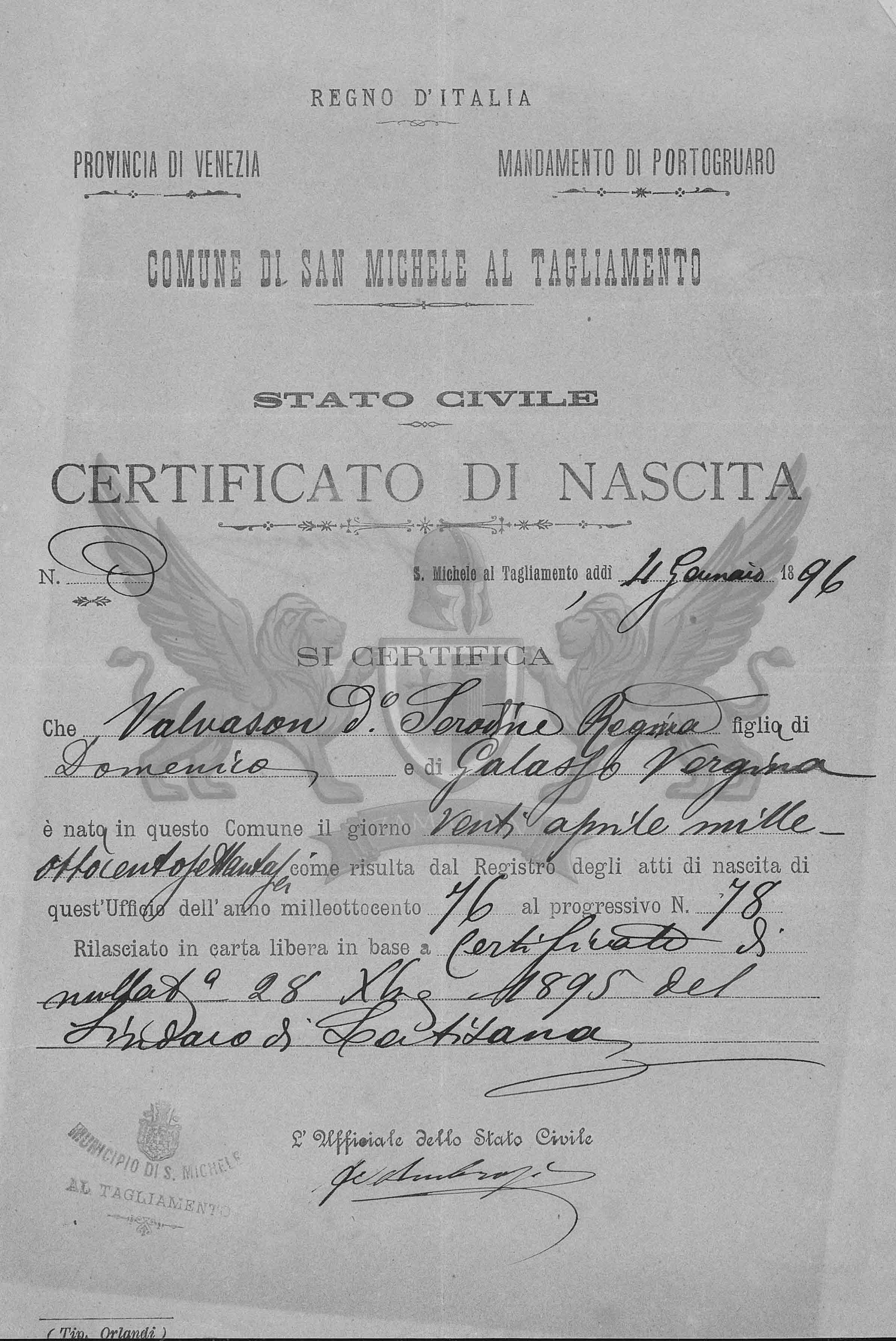 Que Valvason dito Sarodine Regina filho de Domenico e de Galasso Virginia nasceu neste município no vinte de abril de mil oitocentos e setenta e seis como resulta do registro dos atos de nascimento do ano mil oitocentos e setenta e seis ao progressivo Número 78.