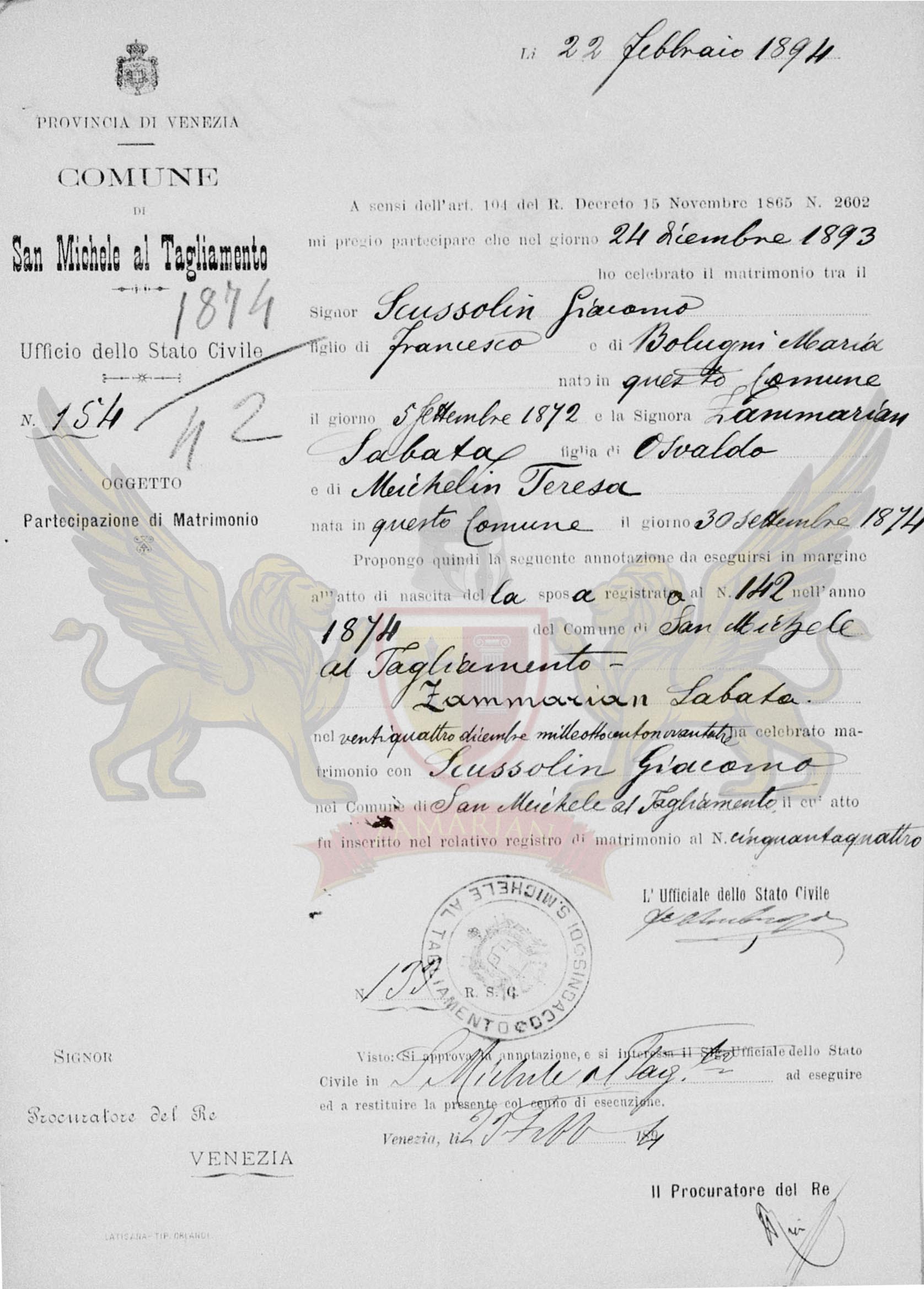 A sensos do artigo 104 do Régio Decreto de 16 de Novembro de 1865 número 2602 me compete participar que no dia 24 de dezembro de 1893 celebrei o matrimônio do Senhor Scussolin Giacomo filho de Francesco e de Bolugni Maria nascido neste Município dia 5 de Setembro de 1872 e a Senhora Zammarian Sabata filha de Osvaldo e de Michelin Teresa nascida neste Município dia 30 de setembro de 1874.