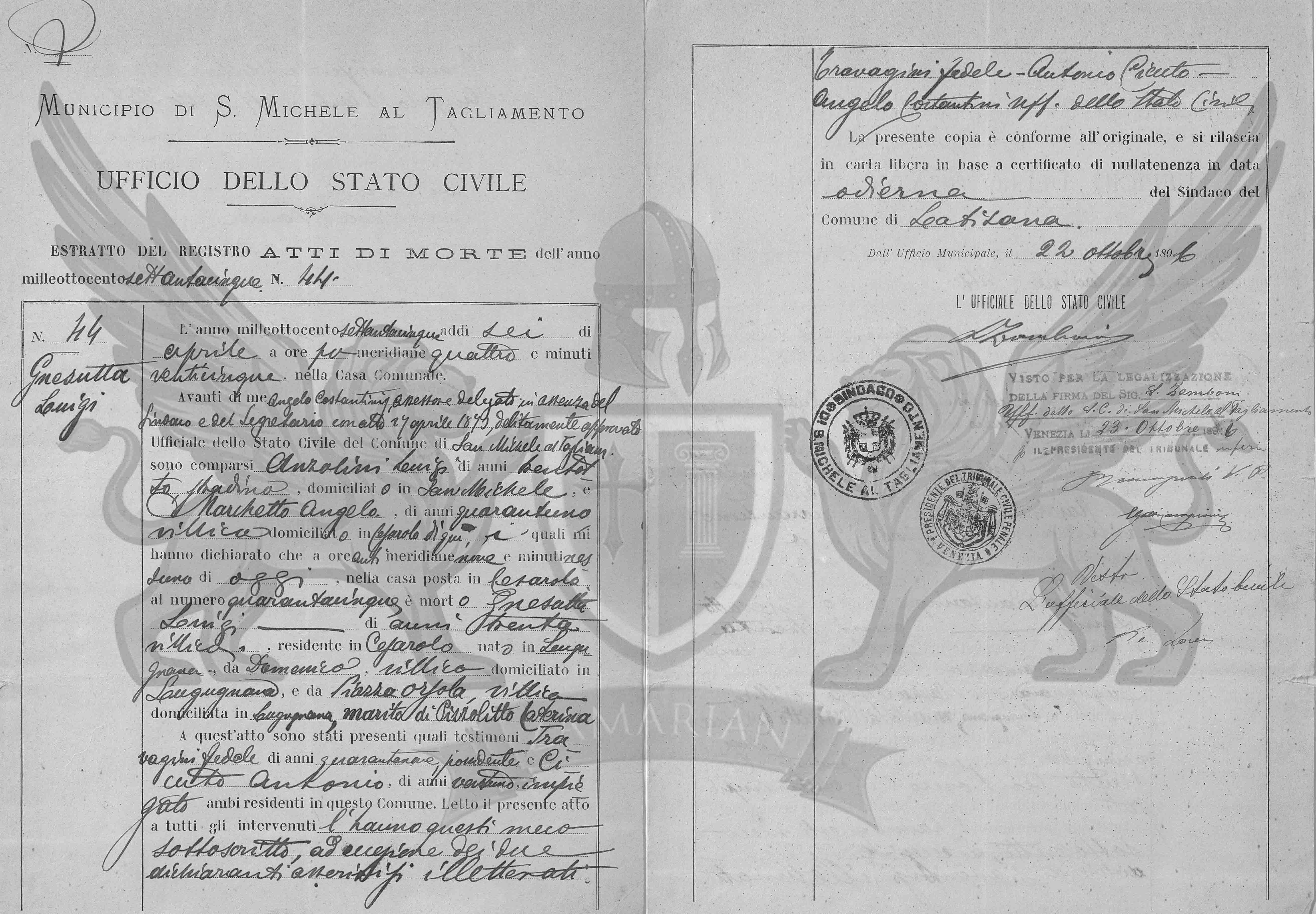 A mesma declarante me denunciou o nascimento supracitado por ter assistido o parto de Pizzolitto Caterina, e no lugar do marido desta porque o mesmo faleceu no dia seis de abril passado.