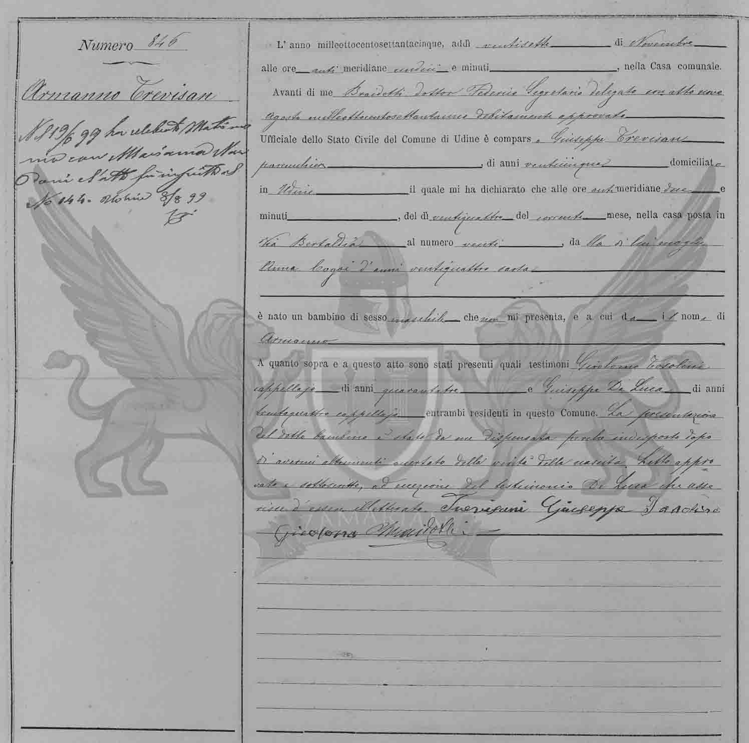Diante de mim Braidotti doutor Federico secretário delegado com ato nove de agosto de mil oitocentos e setenta e um devidamente aprovado, Oficial do Registro Civil do Município de Udine, compareceu Giuseppe Trevisan, cabeleireiro, de vinte e cinco anos, domiciliado em Udine, o qual me declarou que às ante meridiana dez horas, do dia vinte e quatro do corrente mês, de sua mulher Anna Cogoi, de vinte e quatro anos, artesã, nasceu uma criança de sexo masculino que não me apresenta, e a qual dá o nome de Armanno.